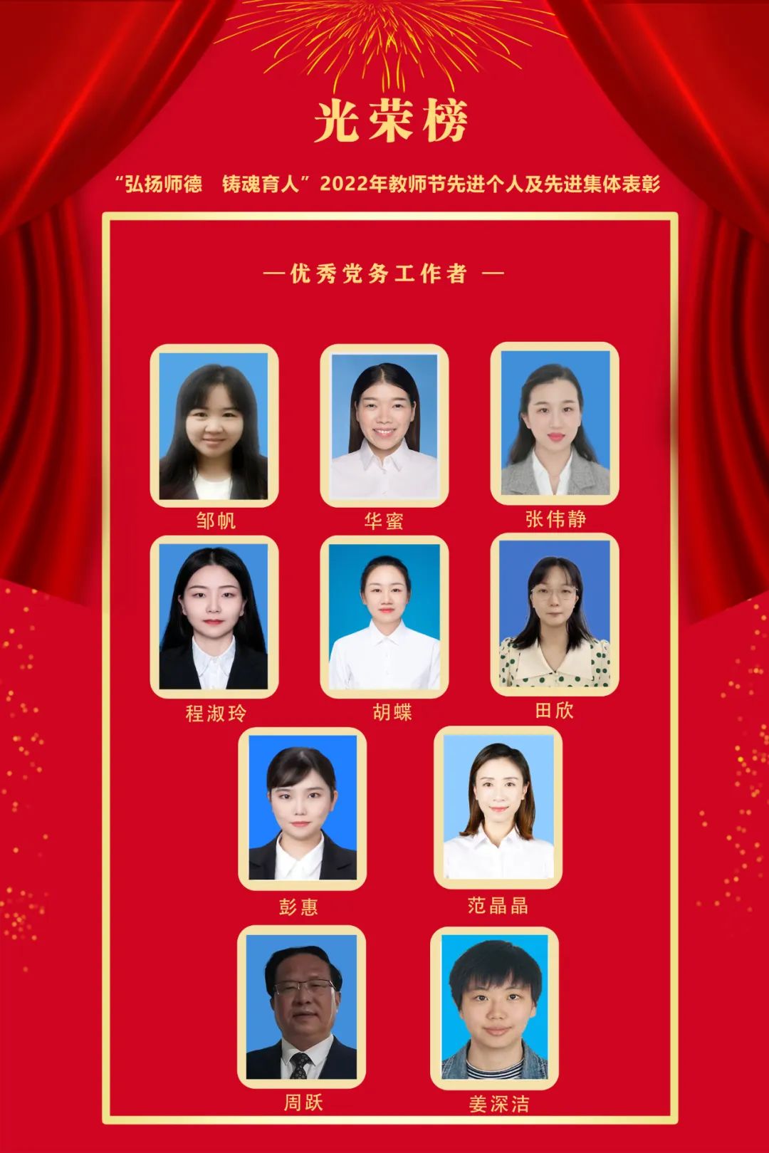 获奖者分别是:邹帆、华蜜、张伟静、程淑玲、胡蝶、田欣、彭惠、范晶晶、周跃、姜深洁