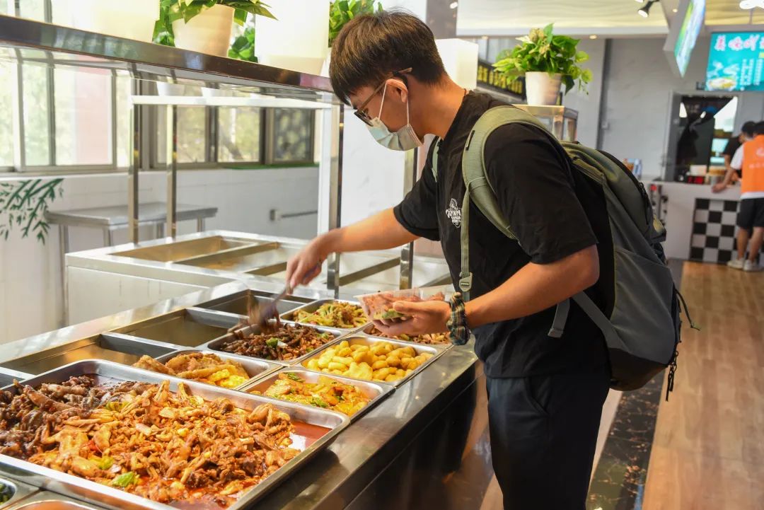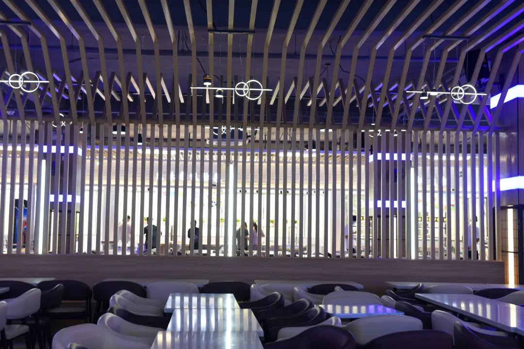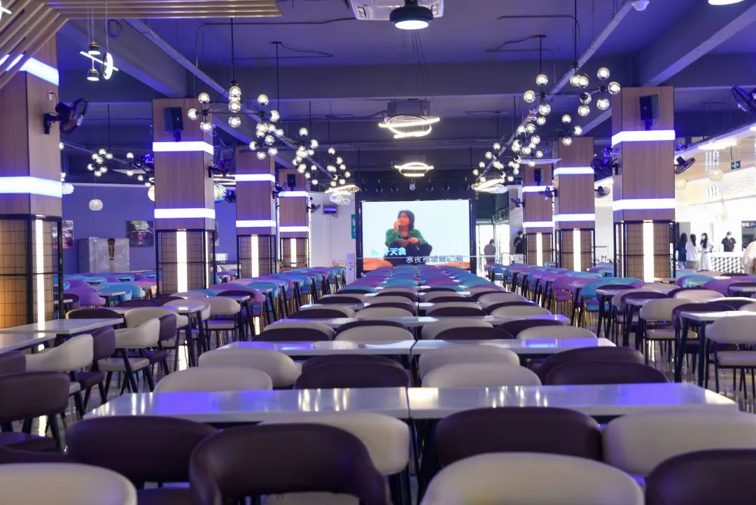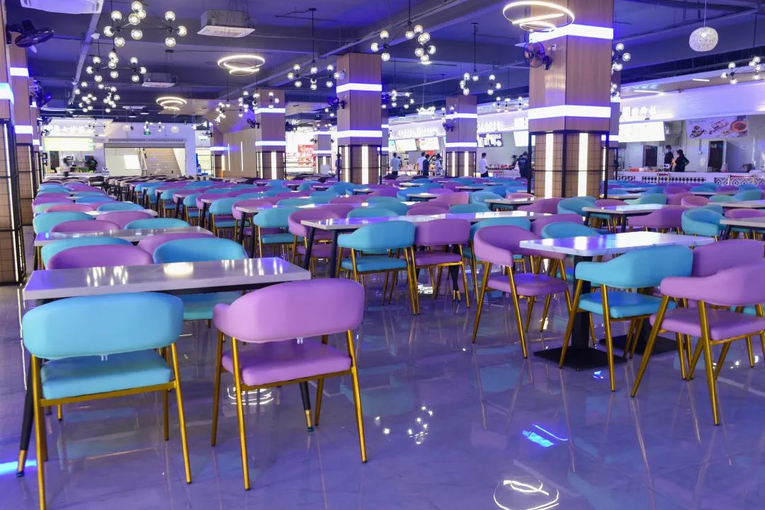 每天不可或缺的事——吃饭。焕然一新的三食堂,星空顶、氛围灯、粉蓝相撞的座椅成为一道新的风景线。