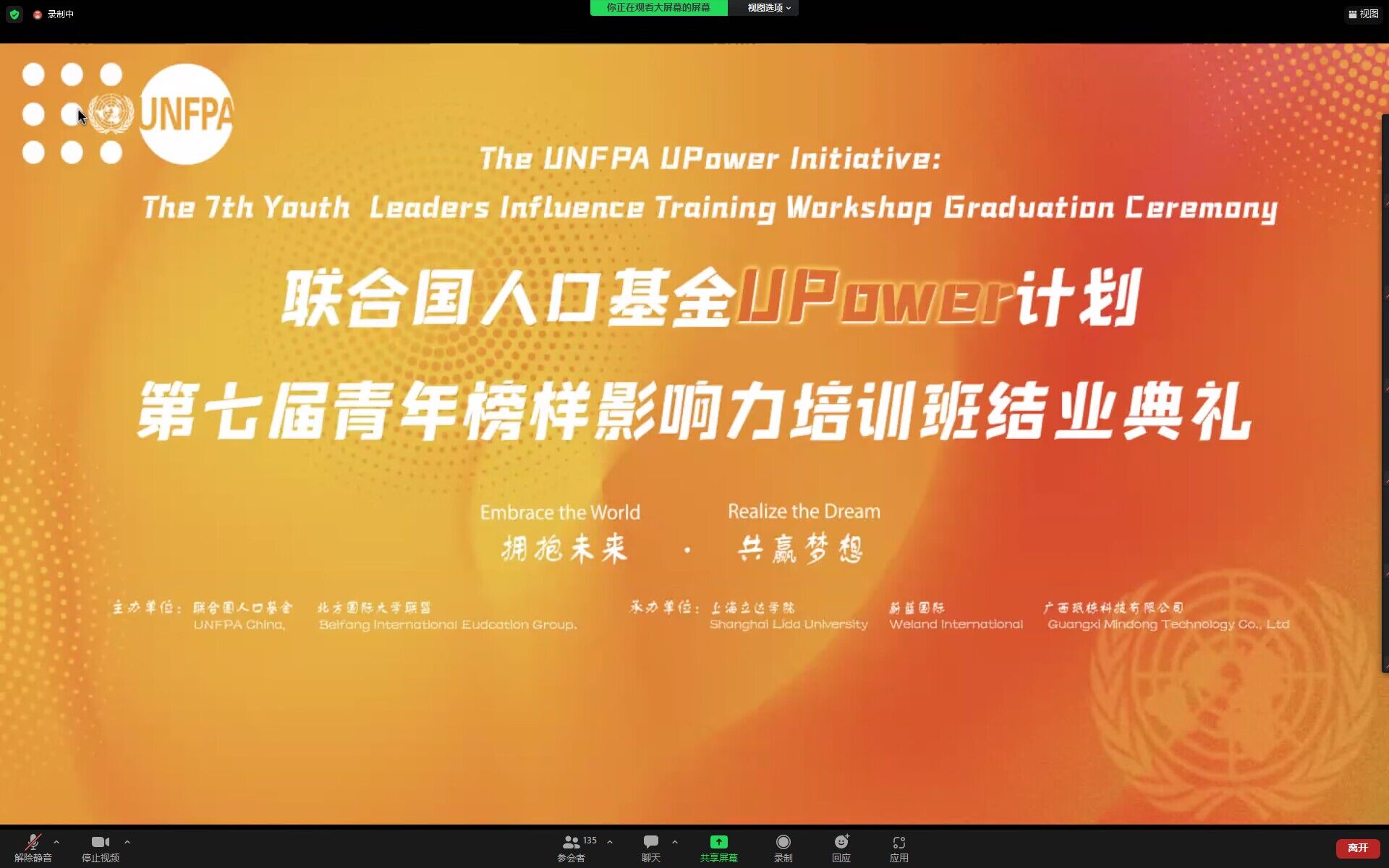 本网讯(大学生记者 曹毅浩 王贲)弘扬青年榜样,汇聚青春力量。9月30日下午,联合国人口基金upower计划:第七届青年榜样影响力培训班闭幕式在上海立达学院举行。上海立达学院校长黄亚钧,联合国世界青年论坛中国代表曹疏野等领导出席活动,来自全国18所高校的155名校园大使通过“线上+线下”的方式参加此次活动。武汉工程科技学院设立分会场,国际教育学院院长陈杨、副院长彭娟,8名校园大使及工作人员参与本次活动。