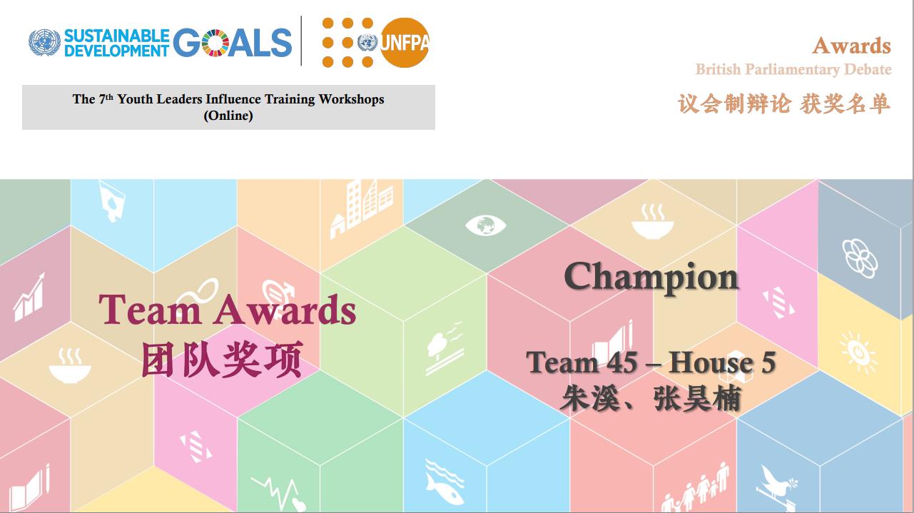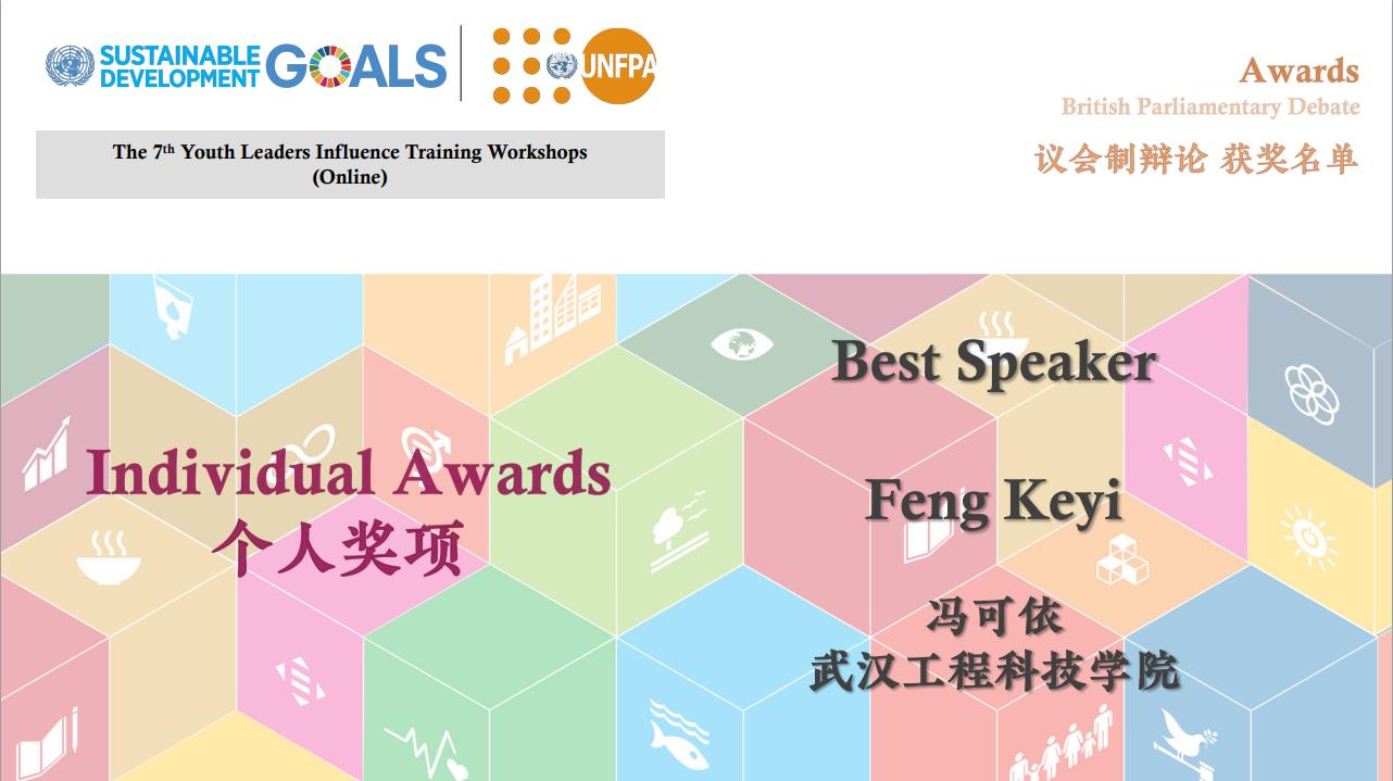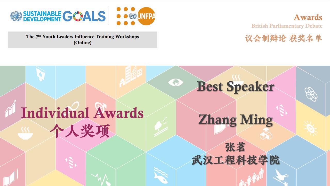 联合国世界青年论坛中国代表曹疏野为优秀学员和团队进行线上颁奖。我校校园大使杨琳同学荣获模拟联合国会议提名奖;冯可依、张茗两位同学荣获议会制辩论Best Speaker奖项;朱溪同学获得小组团体辩论赛冠军。