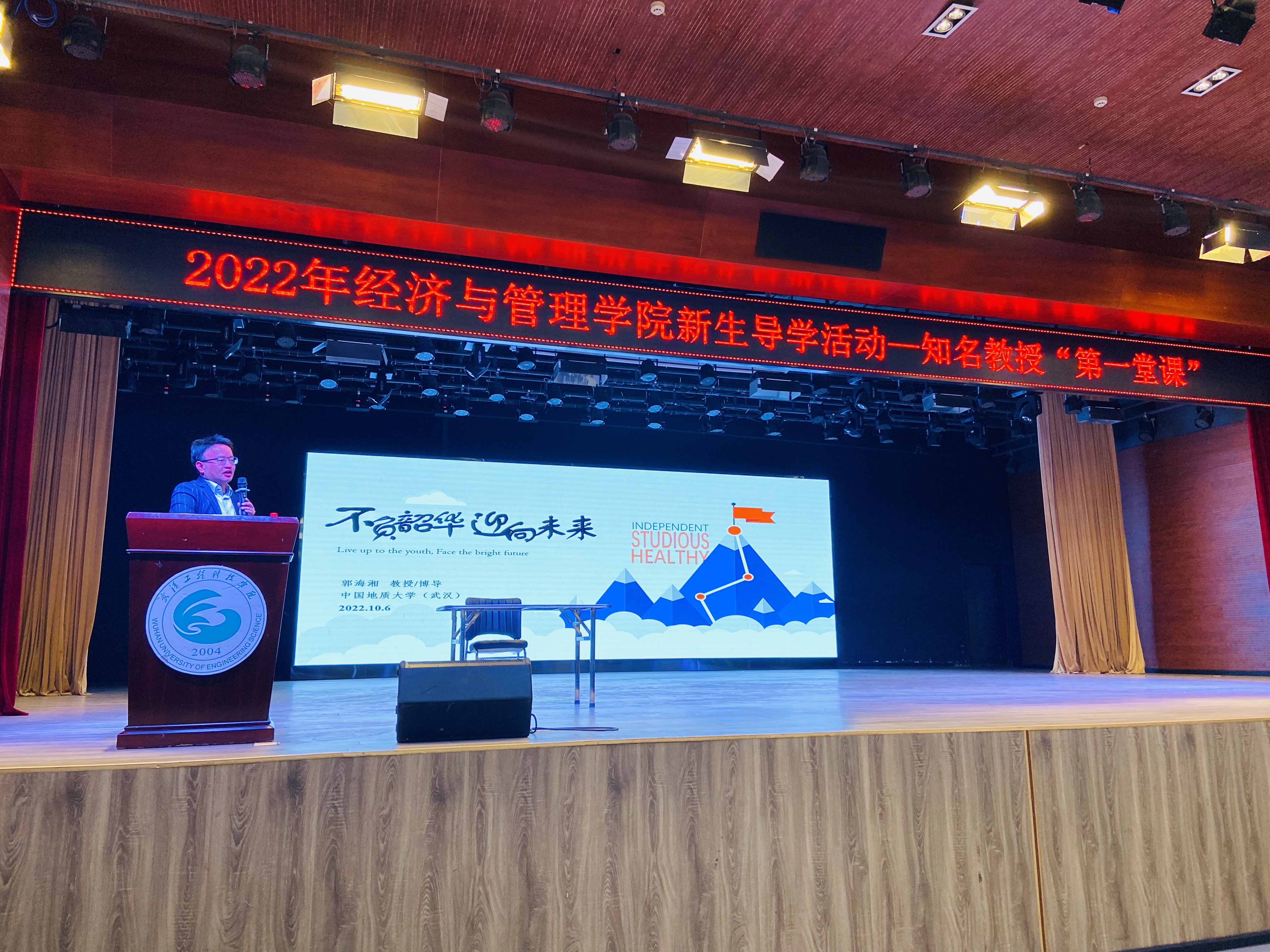 郭海湘教授是中国地质大学(武汉)科学技术发展院副院长、经济管理学院教授、博士生导师,也是政协湖北省经济委员会智库专家和武汉市政府决策咨询委员会委员,共发表论文80余篇,主持过多项国家项目,荣获过多项省级荣誉和奖励。今日,郭教授为我院学子带来了一场接地气的讲座,主题为“不负韶华、迎向未来”。