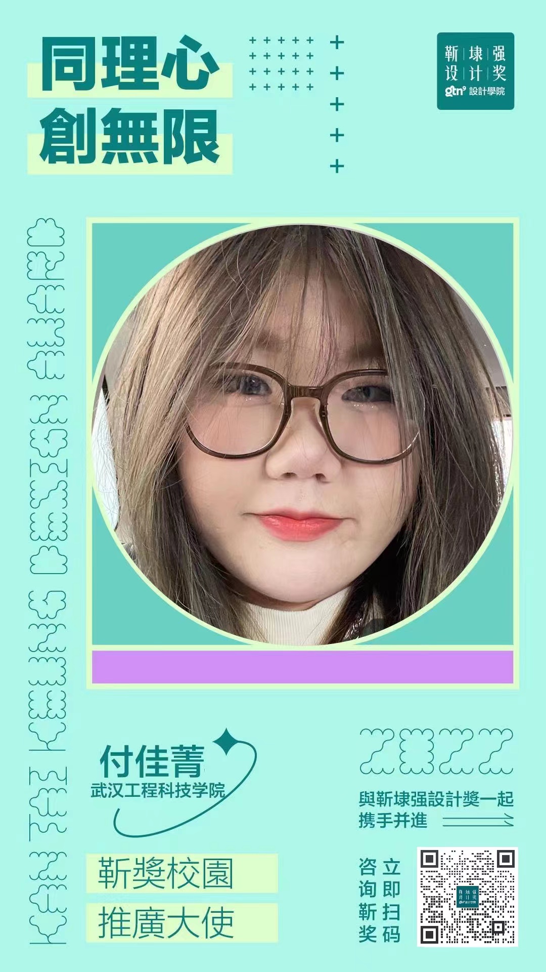 据了解,付佳菁同学此次担任“靳埭强设计奖”校园推广大使,主要负责协助主办方进行校园宣传,积极挖掘身边优秀的同学参赛,以此提升该项赛事的认可度和参与度。
