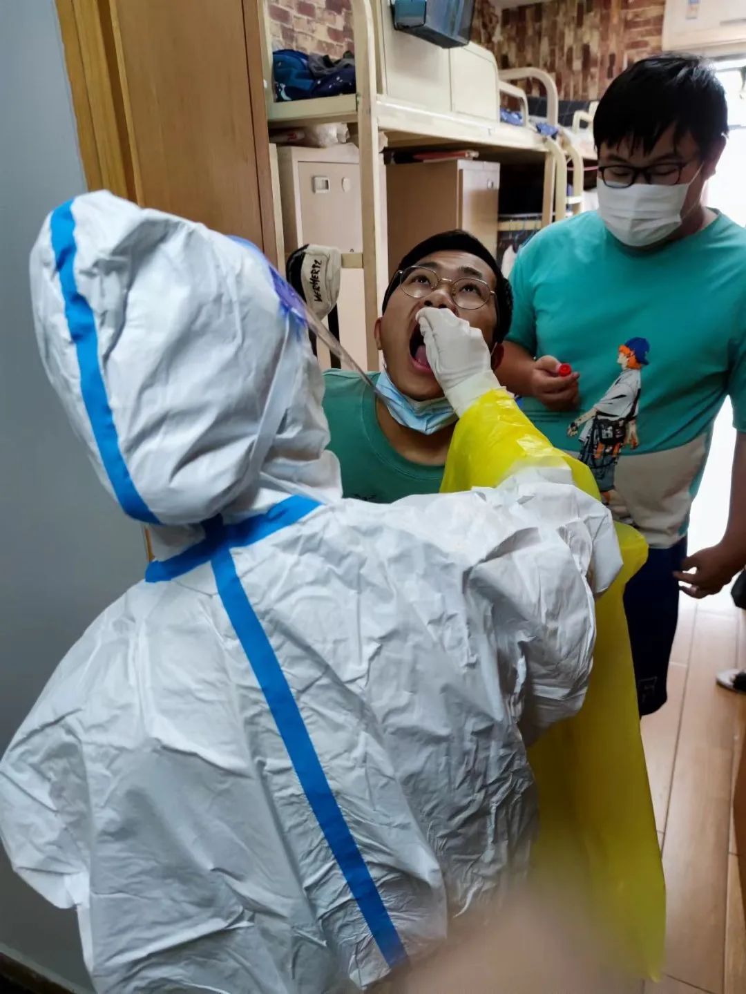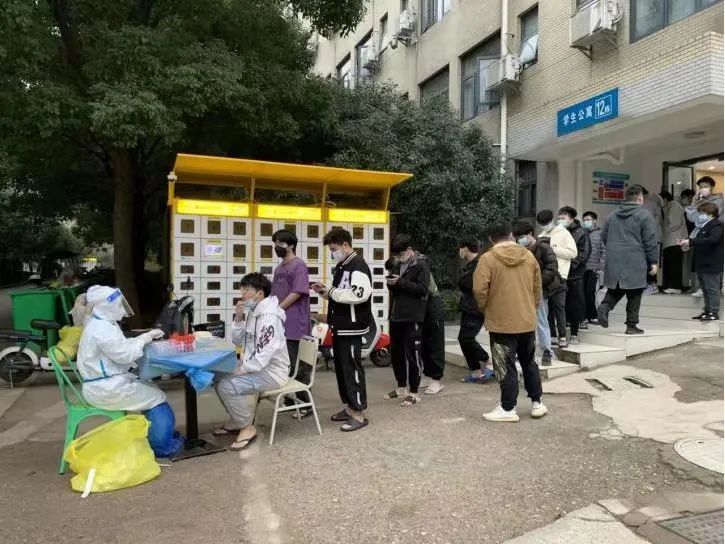 清晨六点,窗外灰蒙蒙的阵阵敲门声打破宁静,“同学,请开门,麻烦打开健康码做核酸”学生干部主动请缨,穿上防护服,戴好口罩,挨个通知同学们下楼进行核酸,每日一检,不漏一人。