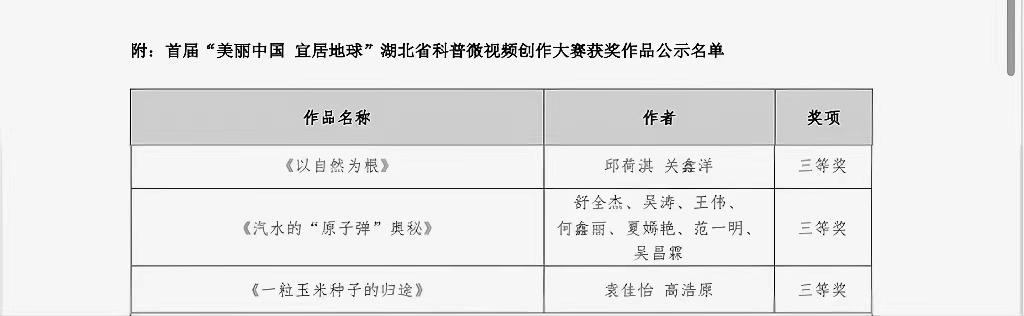 近日,2022年首届“美丽中国 宜居地球”湖北省科普微视频创作大赛结果公示结束,由广播电视系霍冉老师指导的《一颗玉米种子的归途》(作者:袁佳怡、高浩原)获三等奖。