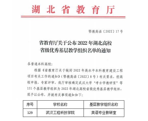 喜报!我校英语专业教研室获批2022年湖北高校省级优秀基层教学组织