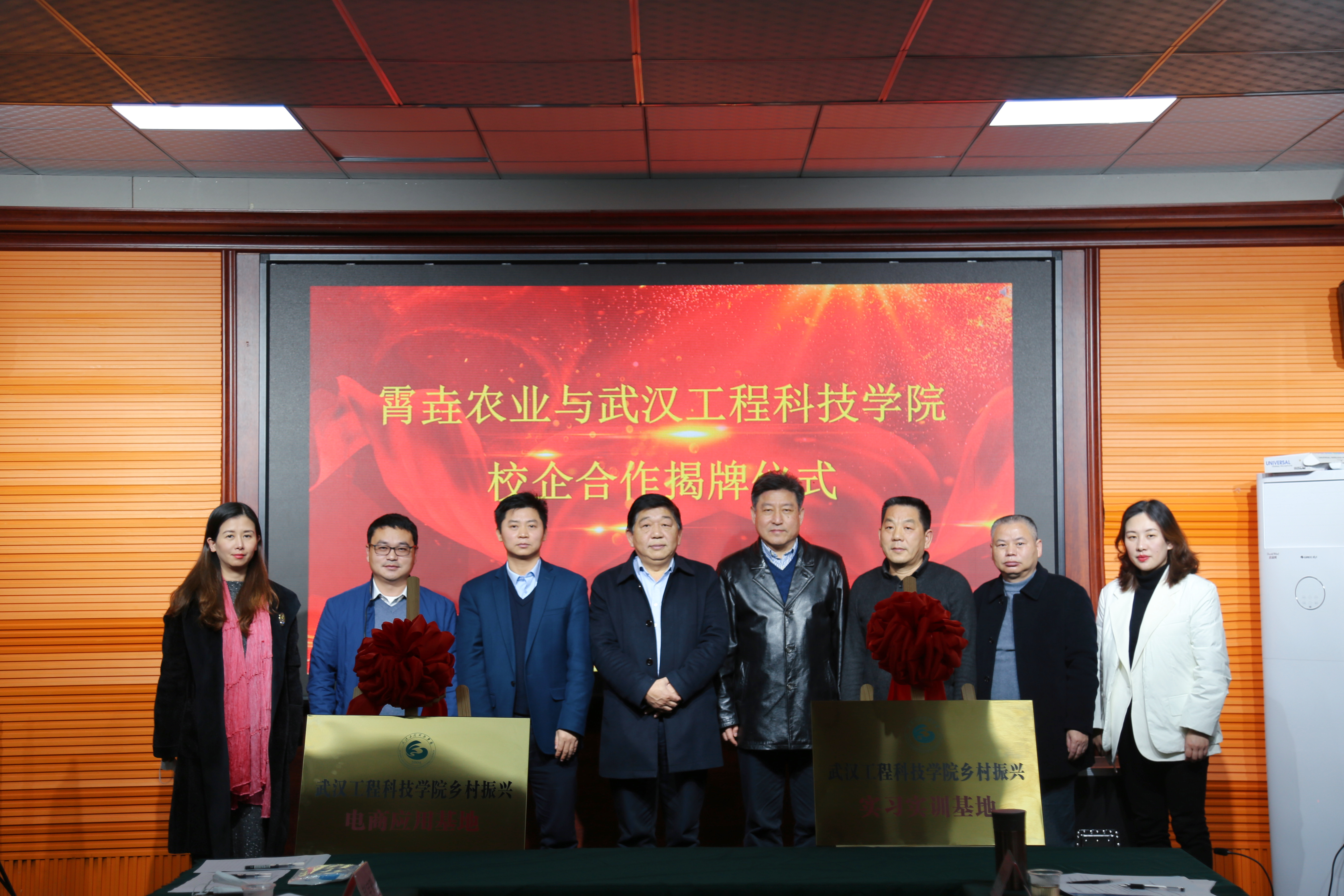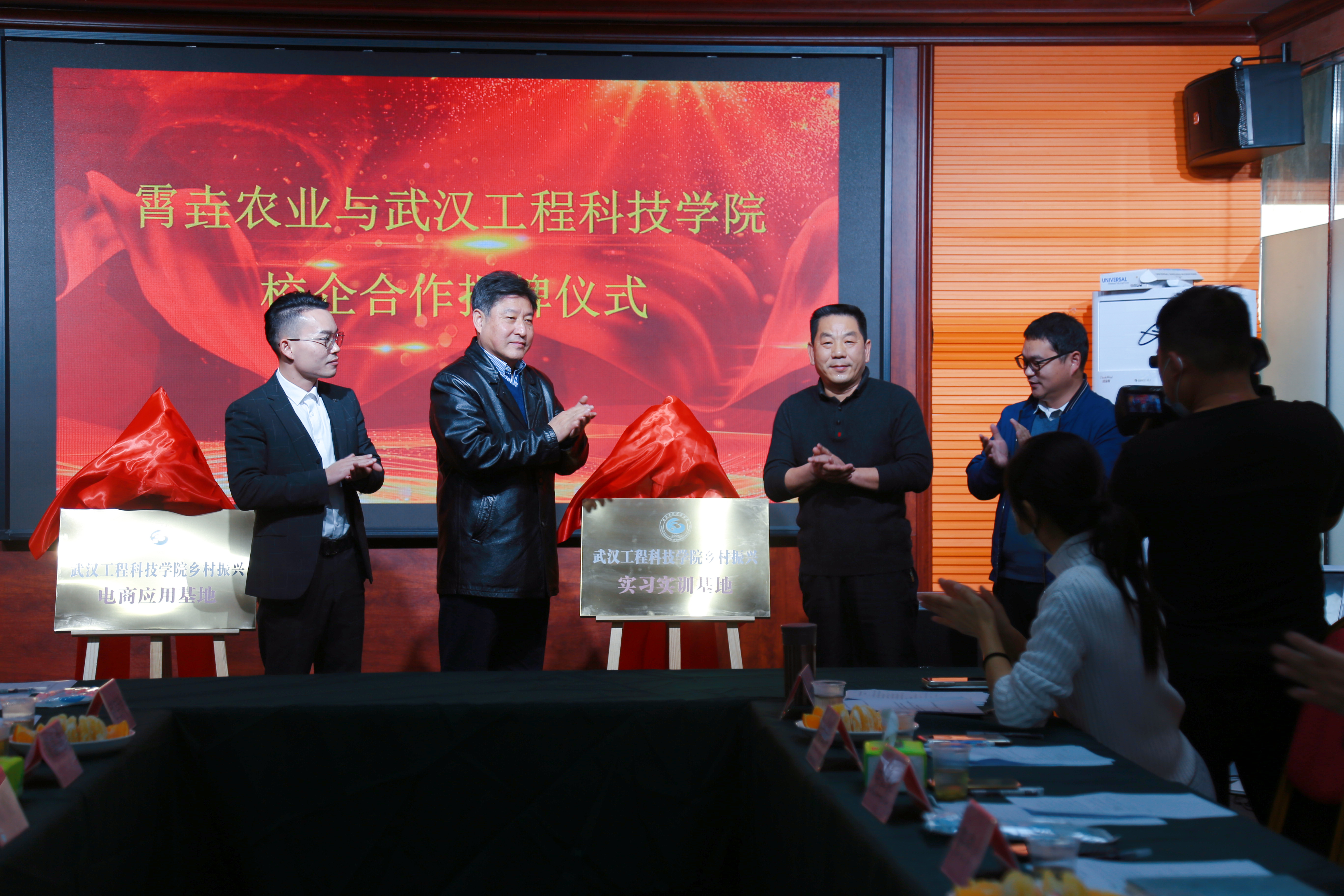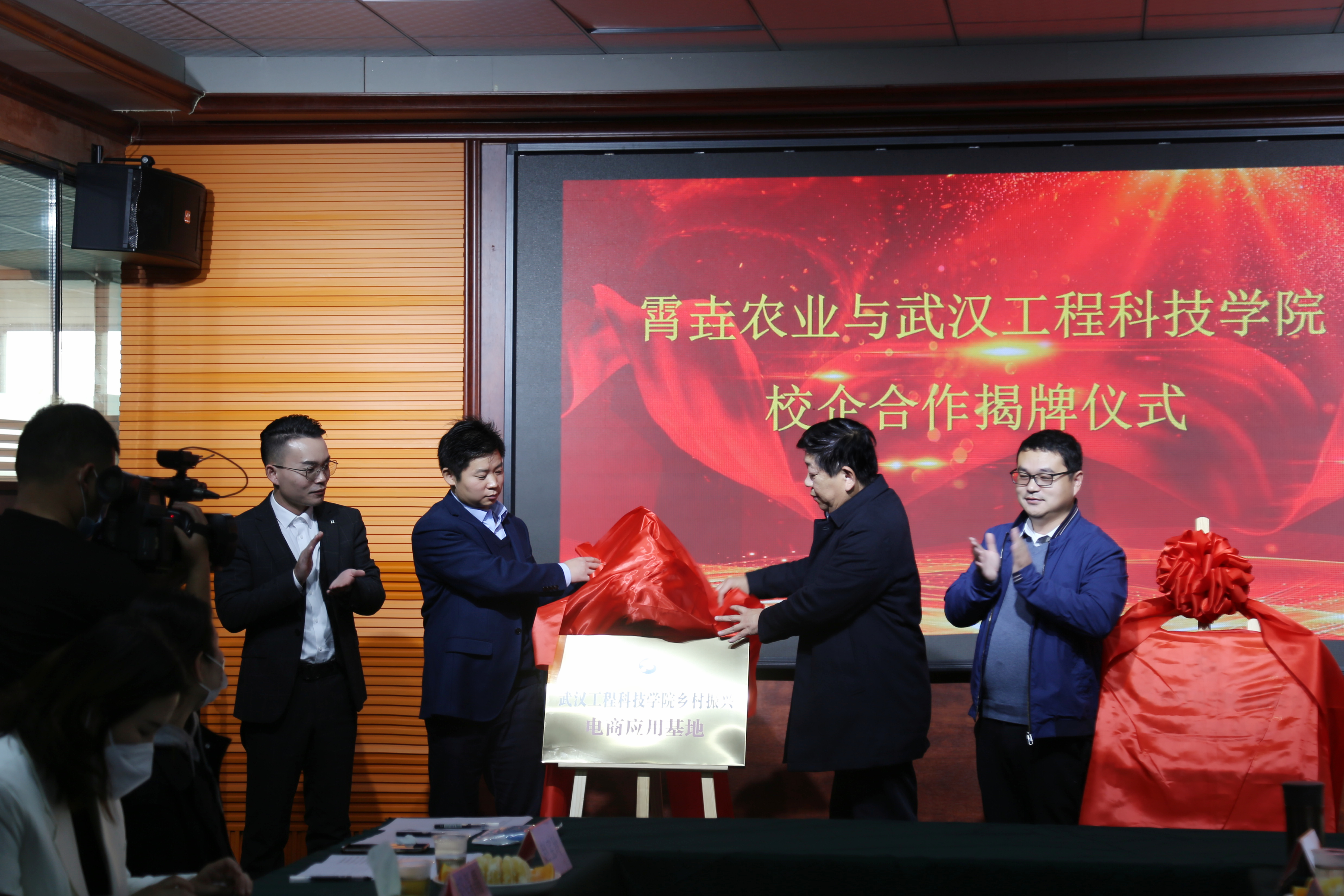 王加青和陈青山共同为武汉工程科技学院乡村振兴电商应用基地揭牌;杨伦和魏修明共同为武汉工程科技学院乡村振兴实习实训基地揭牌。
