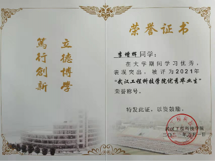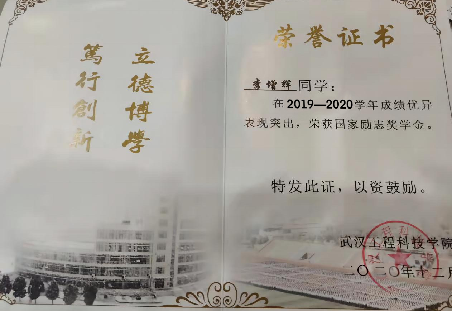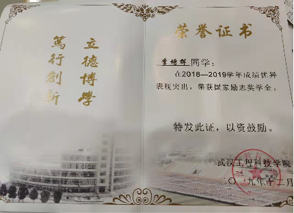 对于今年竞争格外激烈的国家奖学金评选,李增辉用“意外”两个字来形容自己获奖时的心情。当被问到何时开始向国奖发起冲击时,李增辉自信坚定地说:“从进入武汉工程科技学院的那一刻起,获得国奖便成为了我的奋斗目标。”