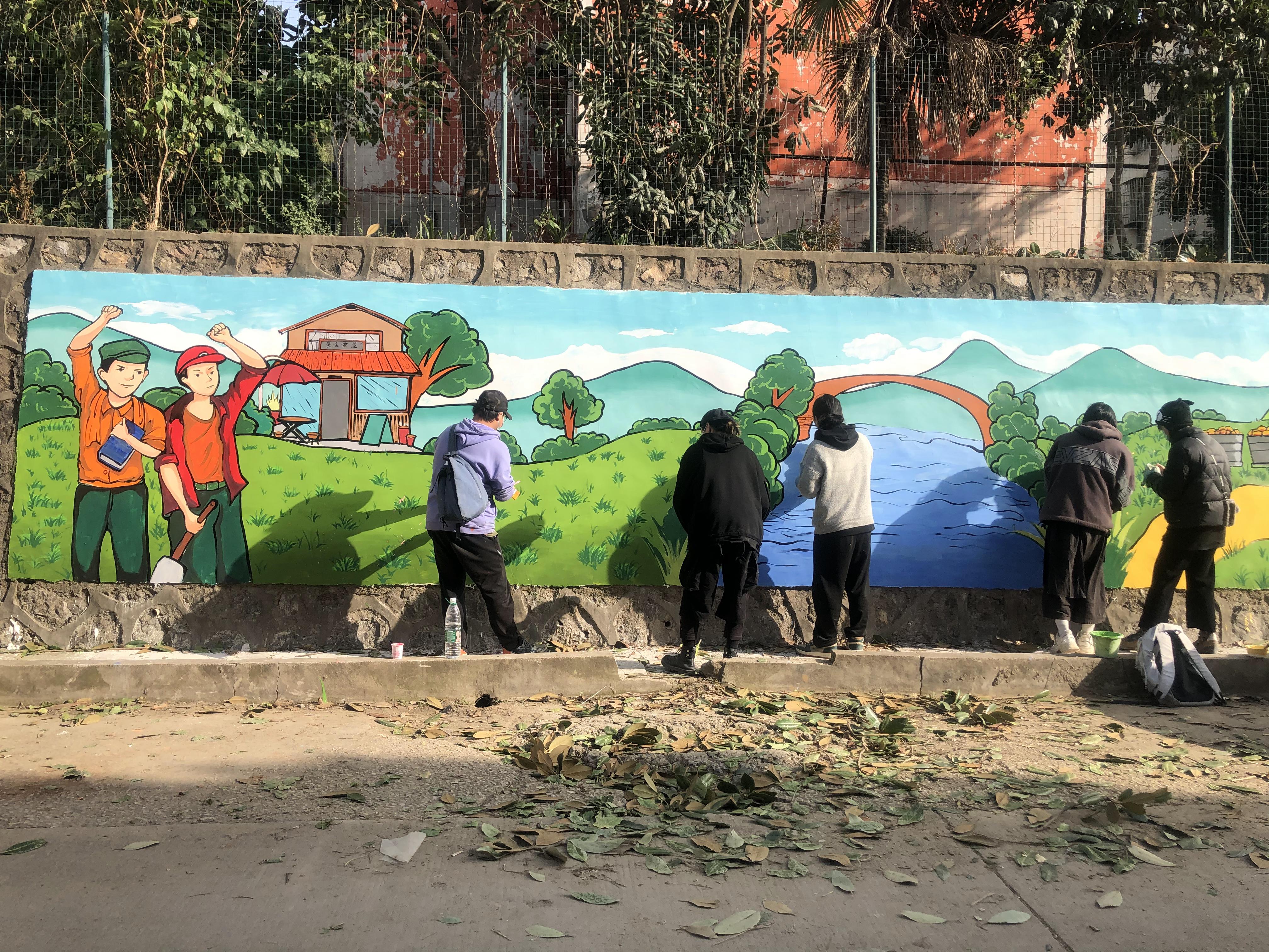 11月下旬,杨竹音老师实地考察该社区之后,将该项目的宗旨理念融入课堂,指导学生将书本知识应用于实际,为黄金小区的四面墙壁图案进行设计。12月11日杨竹音老师和本学院的张应、杨然、白微、谭广渊和段鑫宇五名同学一起驻扎黄金村,从采买到最后完工,仅用了不到三天的时间。