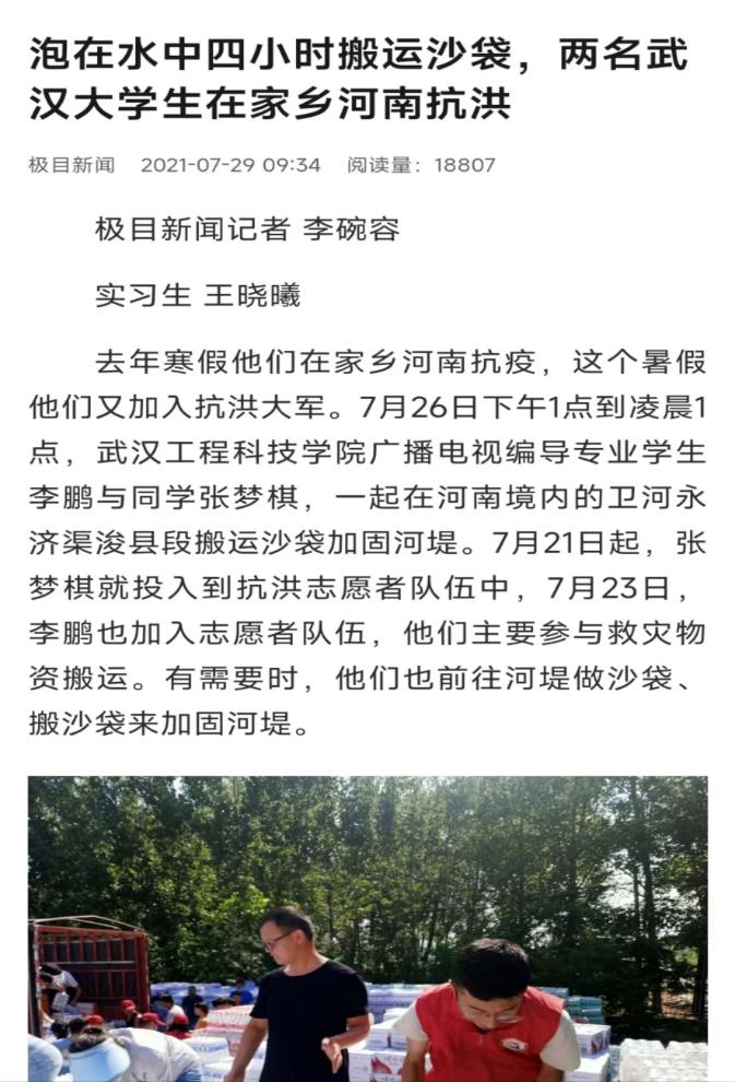 去年7月的一个下午,李鹏和同学一起在河南境内的卫河永济渠浚县段搬运沙袋加固河堤,直到凌晨1点。