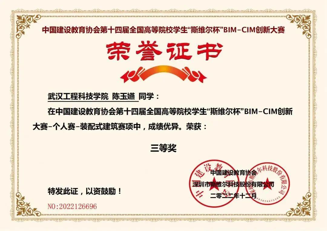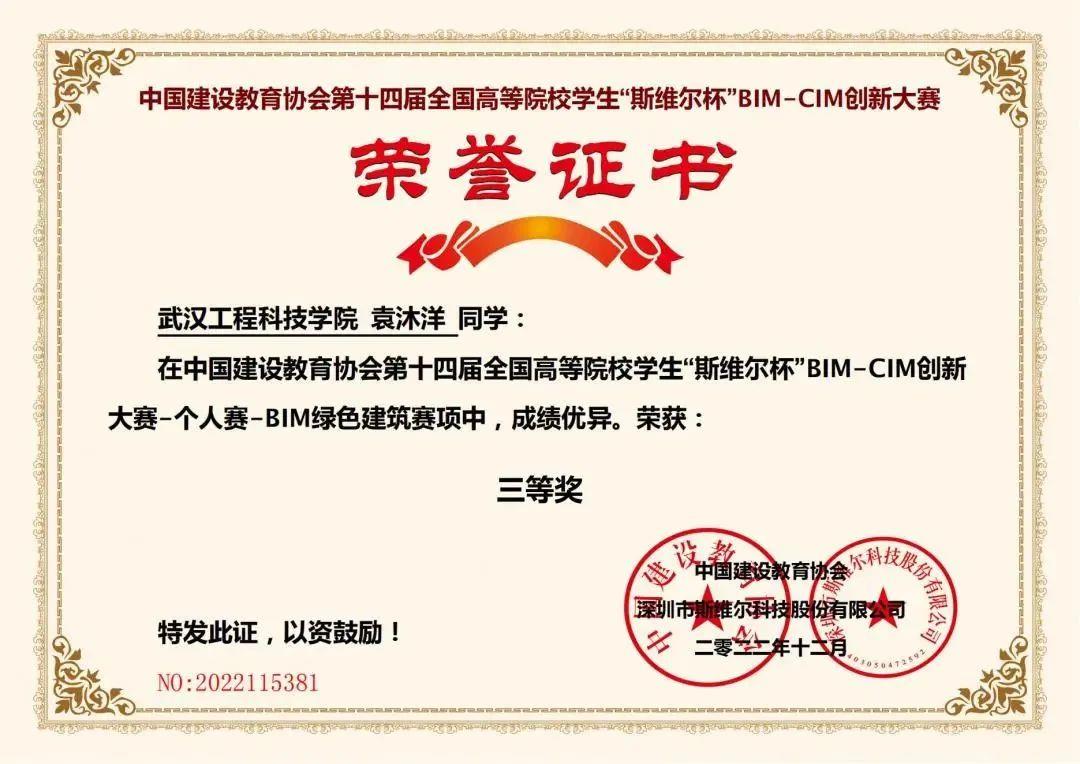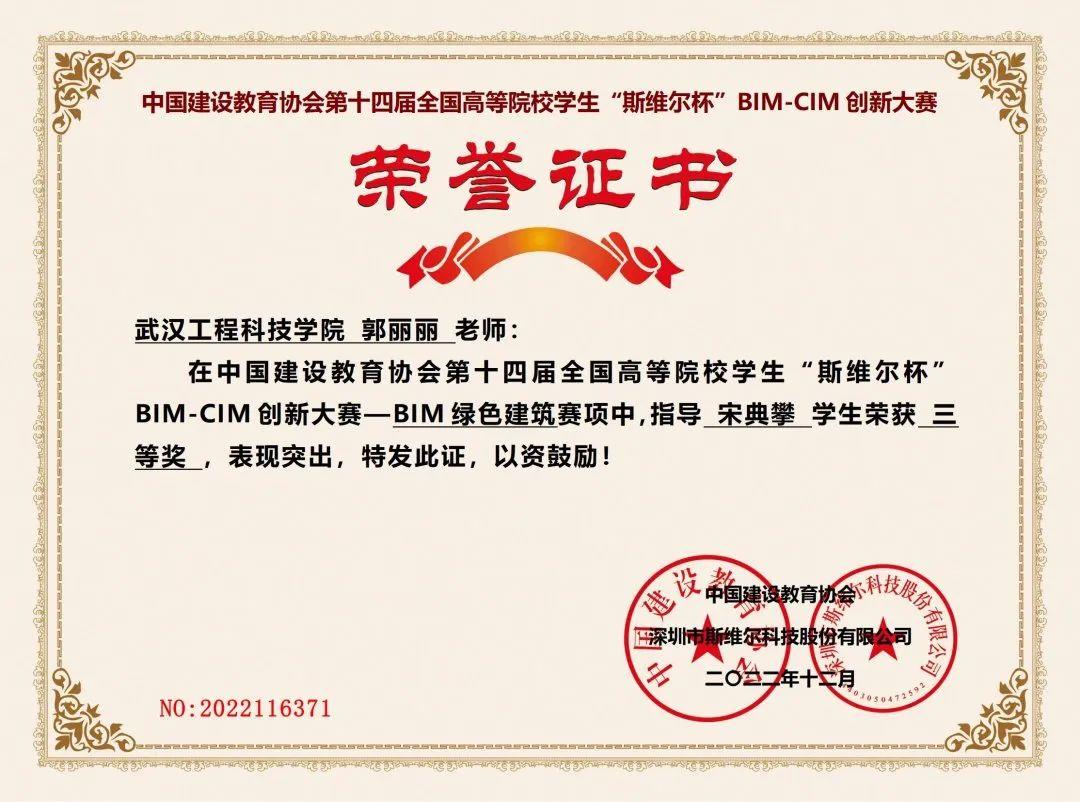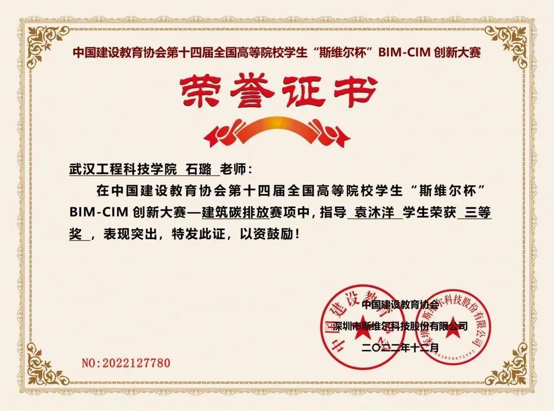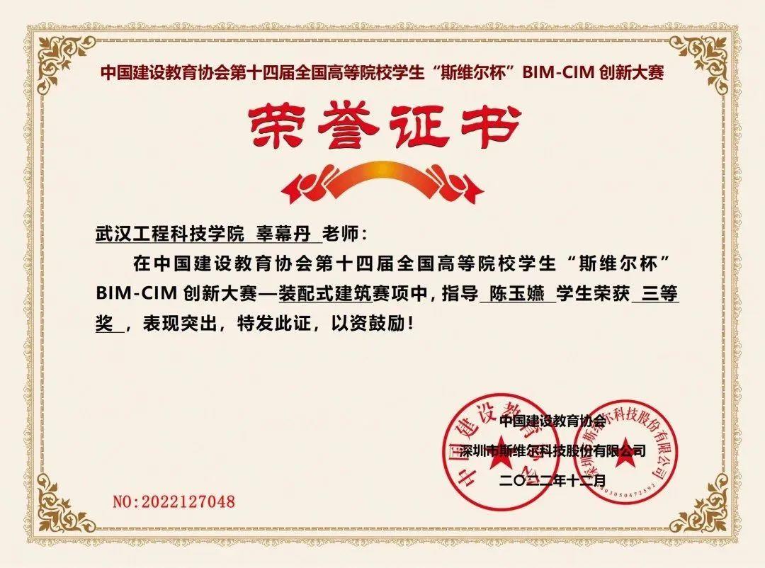 1月10号,从第十四届全国大学生“斯维尔杯”BIM-CIM创新大赛组委会传来喜讯,我校机械与工程学院土木工程教研室组织的竞赛团队,在绿色建筑、建筑装配式技术、建筑碳排放三个专项比赛中勇创佳绩,土木工程教研室石璐、郭丽丽、辜幕丹荣获优秀指导教师,袁沐洋、杨嘉怡、陈玉嬿、宋典攀四位同学在决赛中荣获国家三等奖。