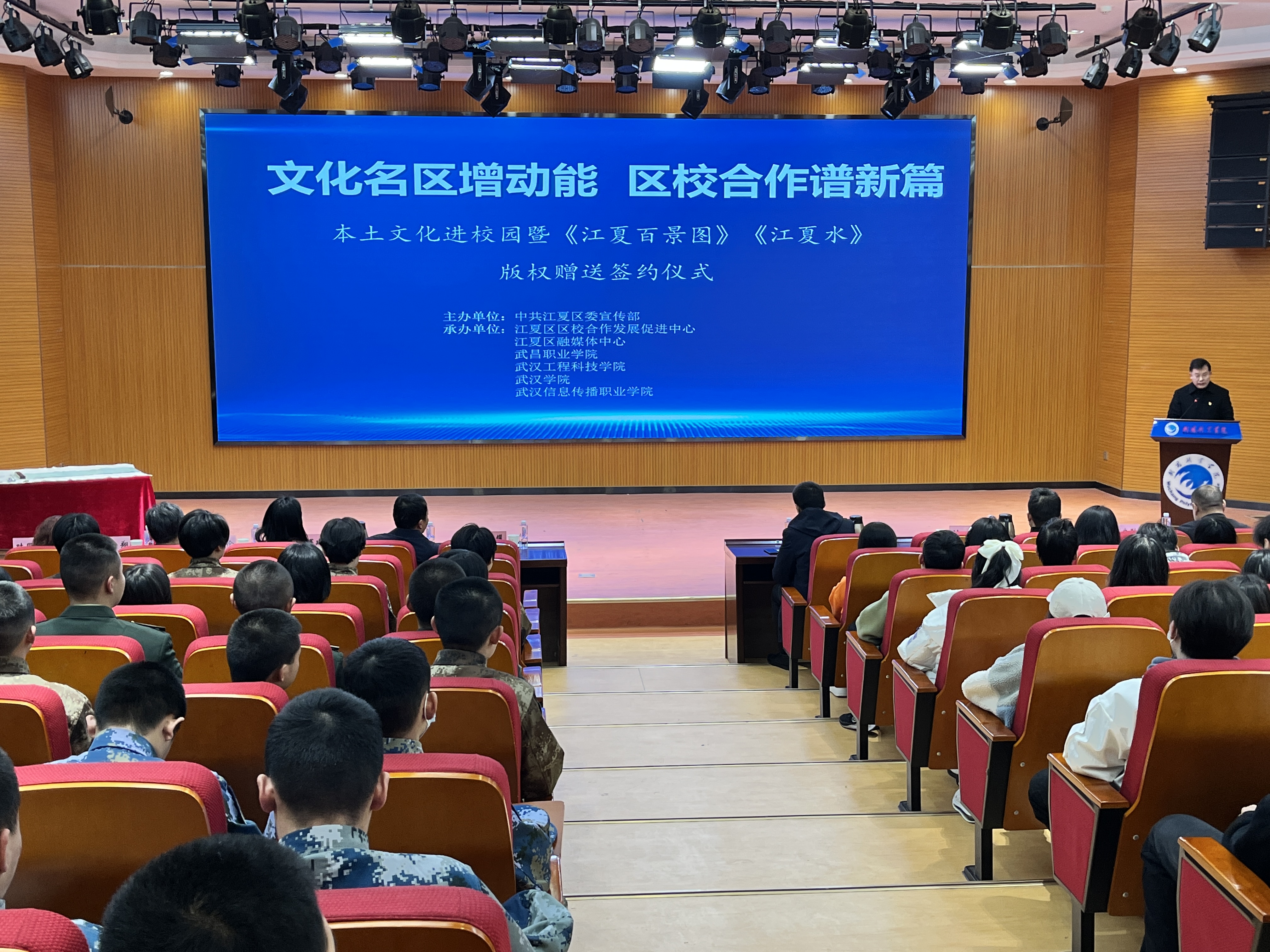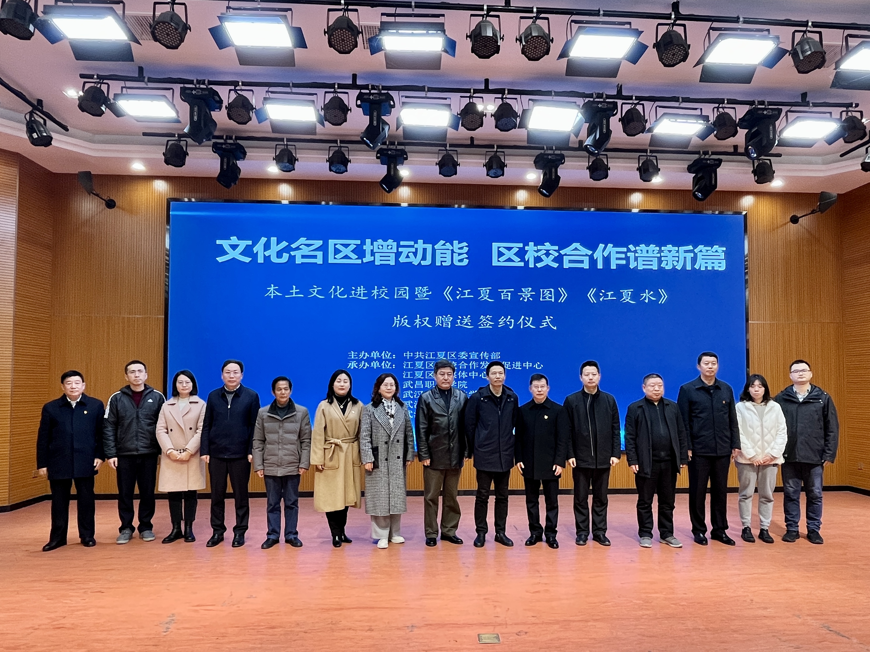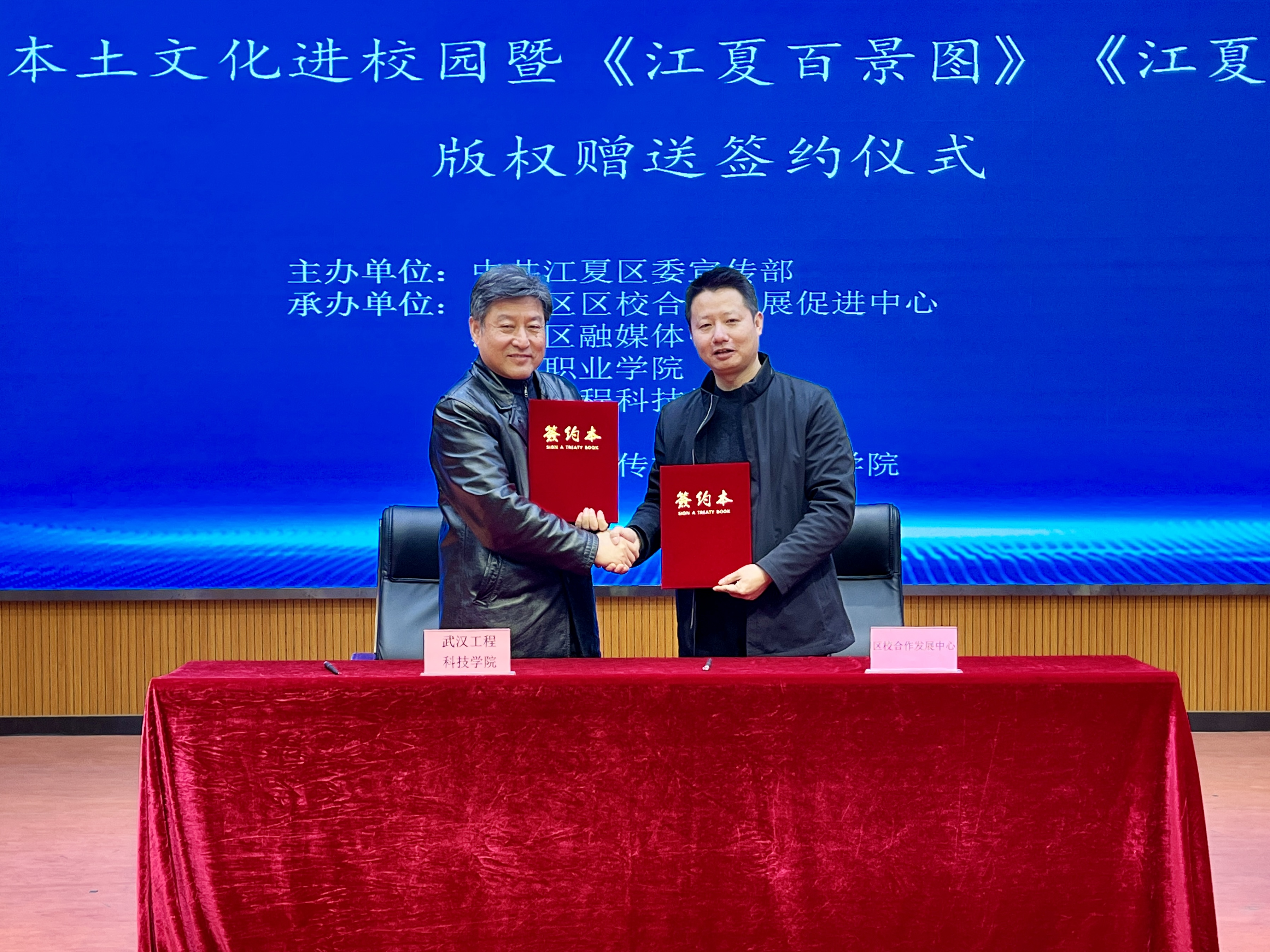 为进一步深入实施“五区”战略,促进区校合作发展,2月24日,《江夏百景图》《江夏水》版权赠送签约仪式在4所高校同步举行,主会场设在武昌职业学院,分会场设在武汉工程科技学院、武汉学院、武汉信息传播职业技术学院。学校党委常委、副校长杨伦,党委常委、党政办公室主任刘美中出席主会场活动,党政办公室副主任张留华及图书馆工作人员参加分会场活动。活动由江夏区委宣传部主办,江夏区校合作发展促进中心、江夏区融媒体中心及上述4高校承办。