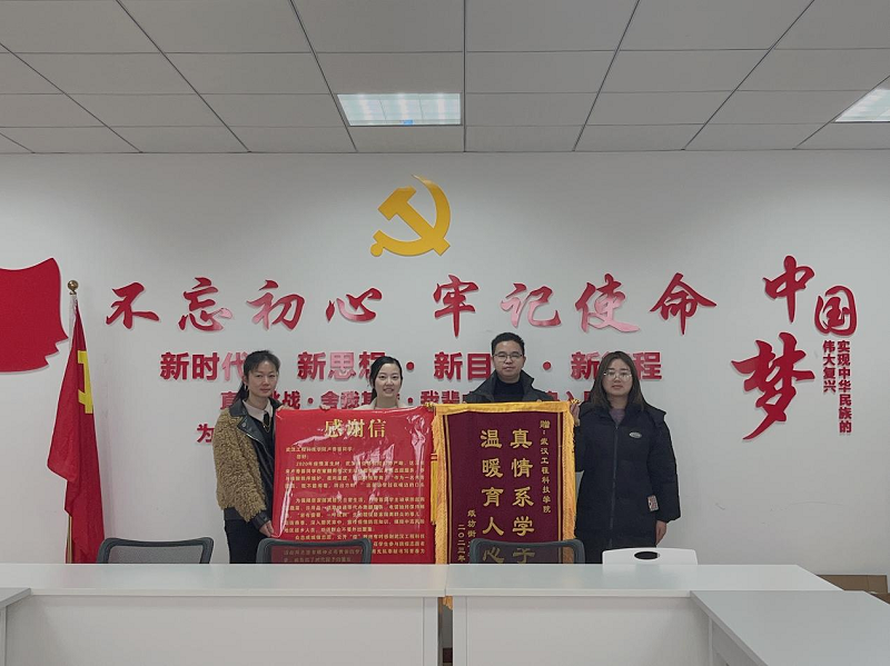 本网讯(通讯员 陶歆雅 周虞)2月28日,武汉工程科技学院经济与管理学院收到了一份特别的礼物。武汉市江夏区纸坊街龙城社区的领导带着“真情系学子,温暖育人心”的锦旗和感谢信来到学校,为经管学院送上诚挚的谢意,经管学院党总支书记王启帆代表学院接受社区锦旗并对社区表示感谢。