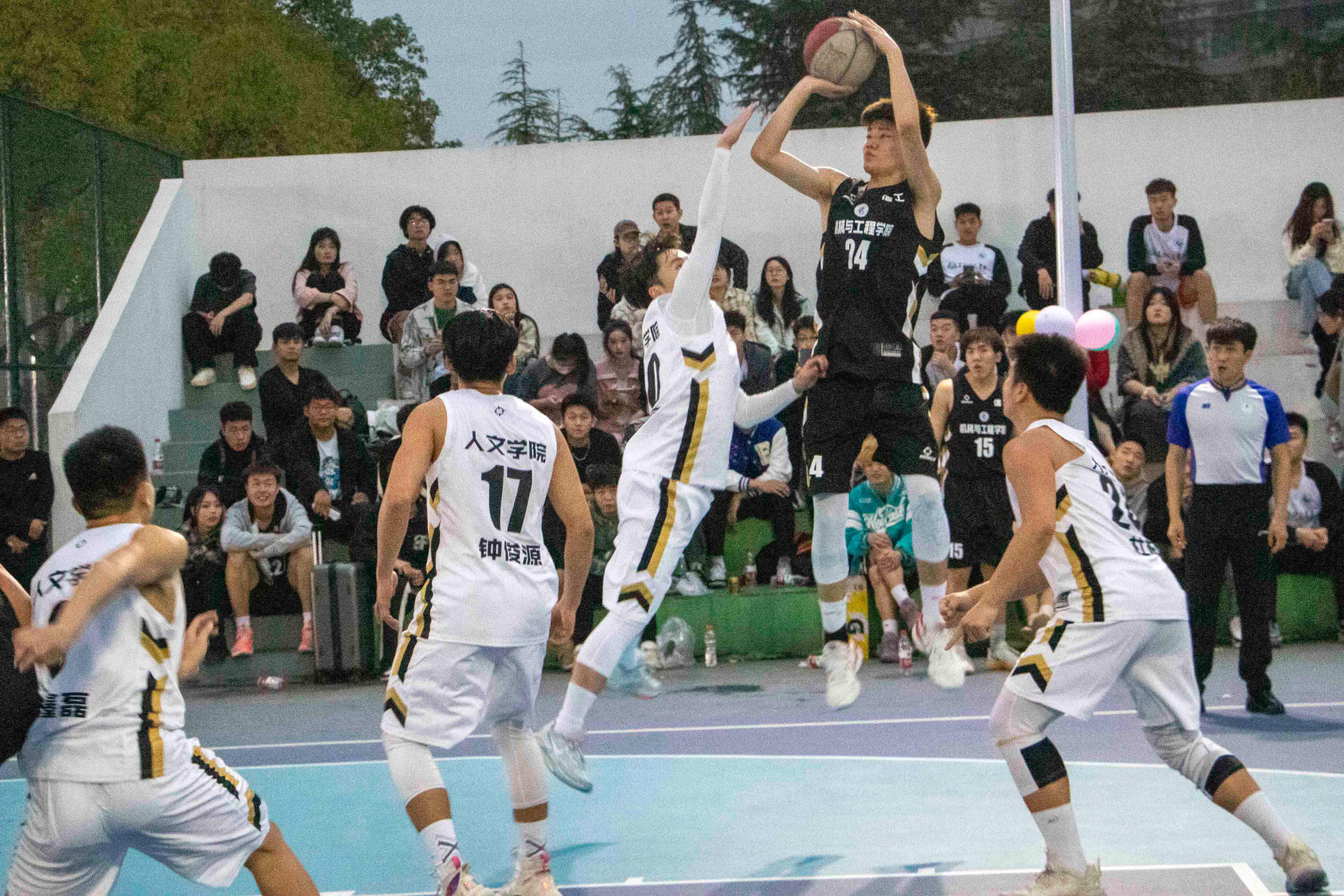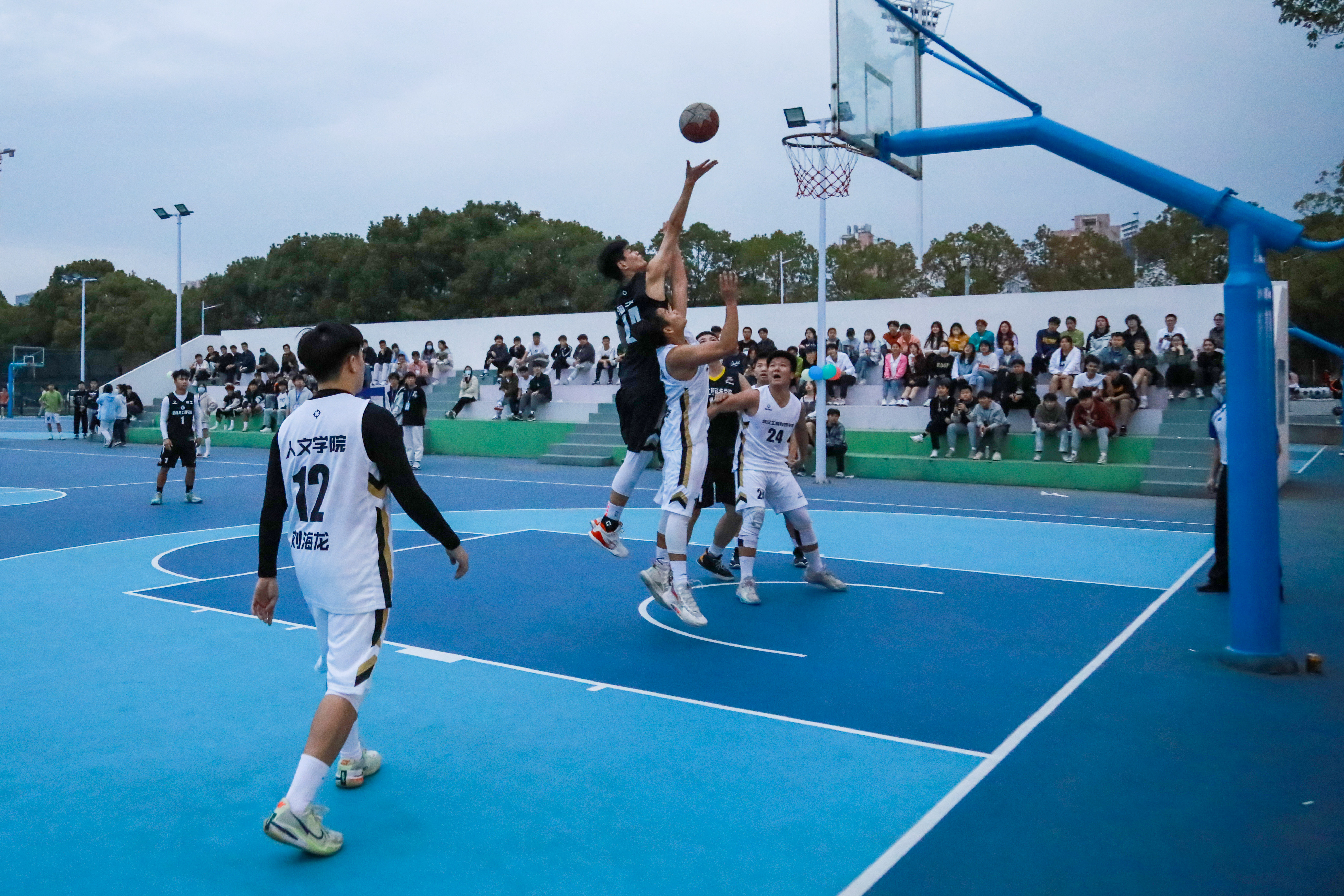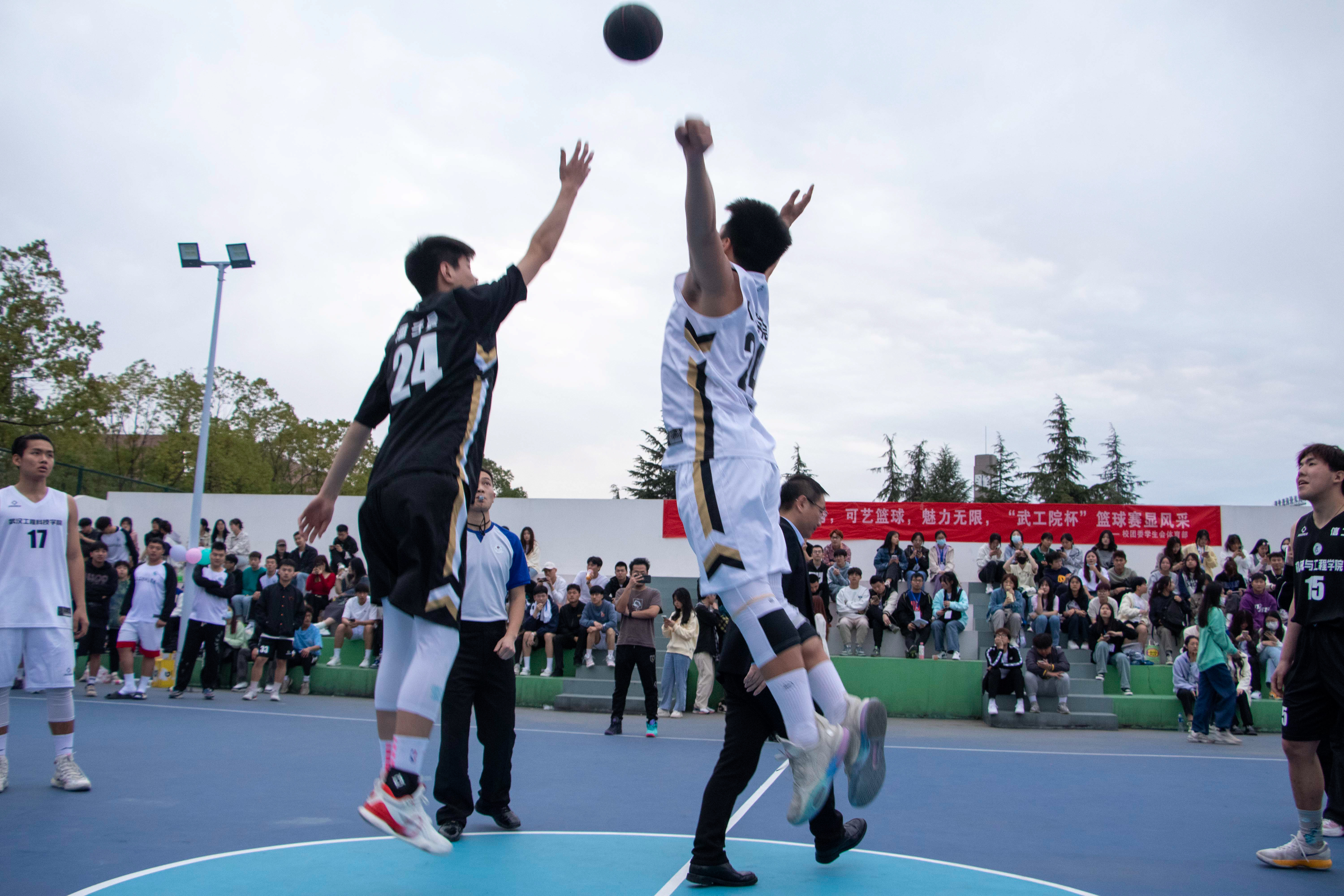 一声哨响,青春飞扬。一记抢断,突然夺舍,转身一掷,欢呼声响,篮球场上运动员挥洒汗水,挥洒青春的活力与朝气,展现着独属于武工院学子的体育精神。