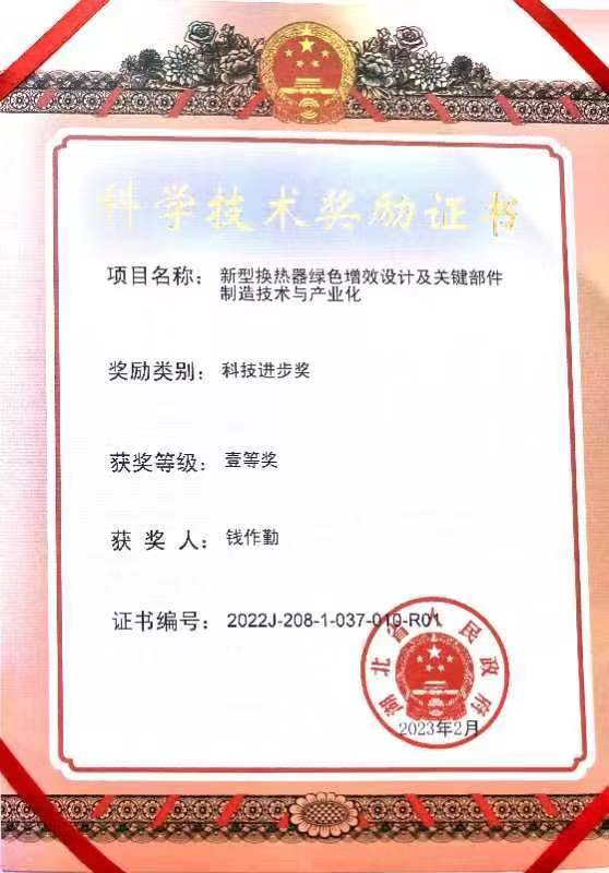 钱作勤教授作为《新型换热器绿色增效设计及关键部件制造技术与产业化》的第一完成人,获2022年湖北省科技进步一等奖。围绕提高大型换热器换热效率、节约能耗等问题,钱作勤教授带领科研团队项目组和相关企业开展了深入的产学研合作,历经十年攻关,开展了一系列技术改革创新,为我国换热器行业的发展做出了重大贡献。
