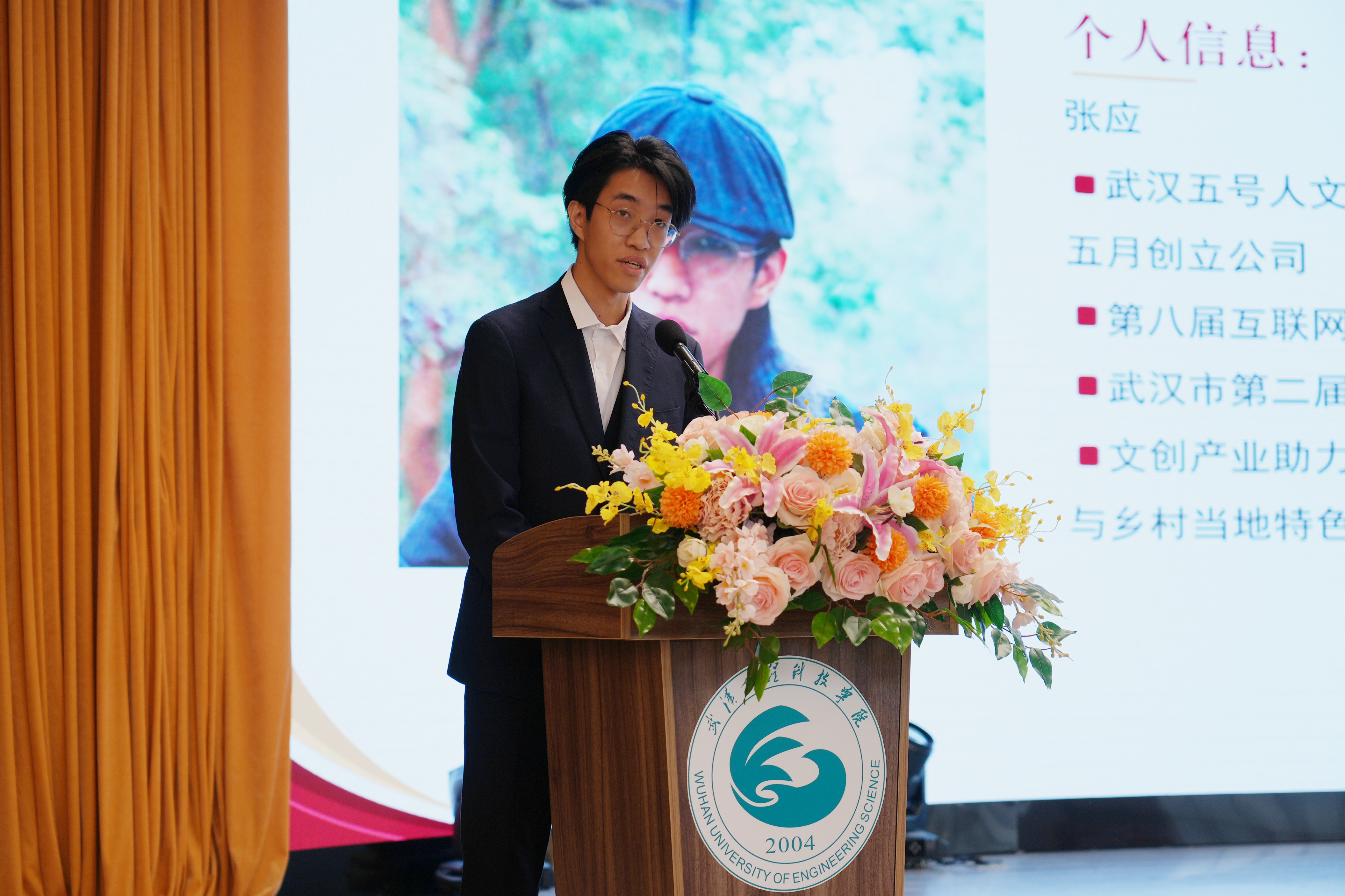 大学生创业代表、2019级视觉传达设计专业的张应介绍了“五号人”创业团队的创办和发展过程。他表示,团队主要业务是墙绘,在创业初期,涉及一些资金和手续问题,获得了政府和学校的大力支持和帮助。去年开始,团队已经与江夏区梁湖农庄建立了密切的合作关系,团队成员们深入到田间地头,用自己的专业技能为当地的文化建设和经济发展贡献了力量。他始终相信,追求兴趣与热爱,能够让我们更加深入地了解自己,找到人生的方向。创业不只是为了实现自己的理想和价值,也是为了更好地服务社会、回馈社会。
