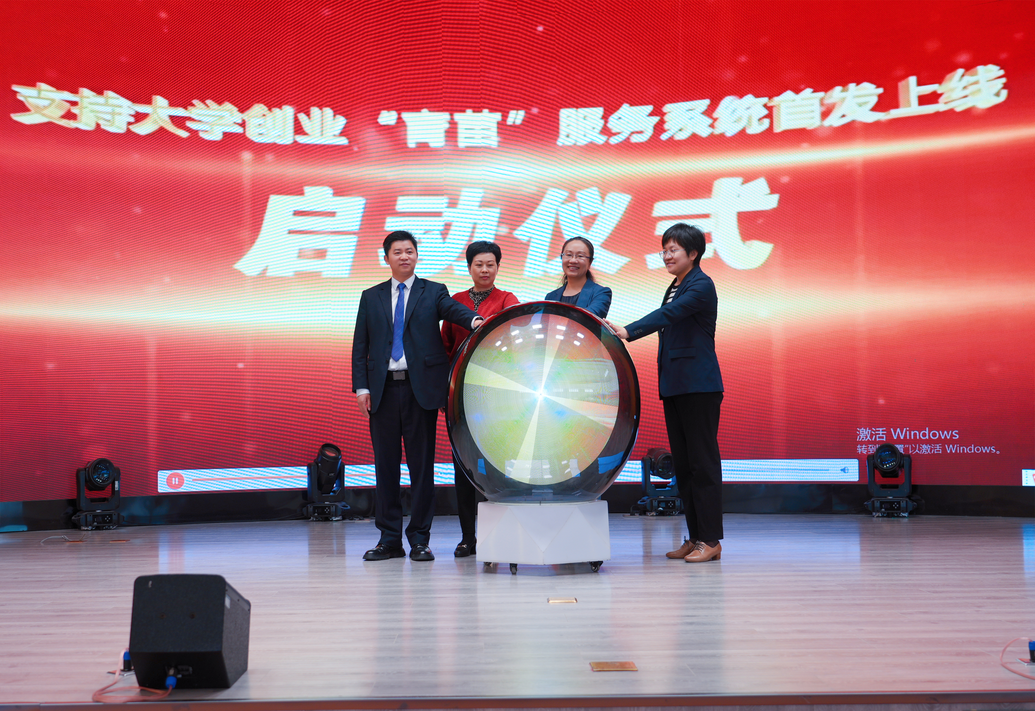 王勤、夏蕾、曾建辉和王加青四位领导上台,共同启动湖北省支持大学生创业“育苗”服务系统首发上线仪式。