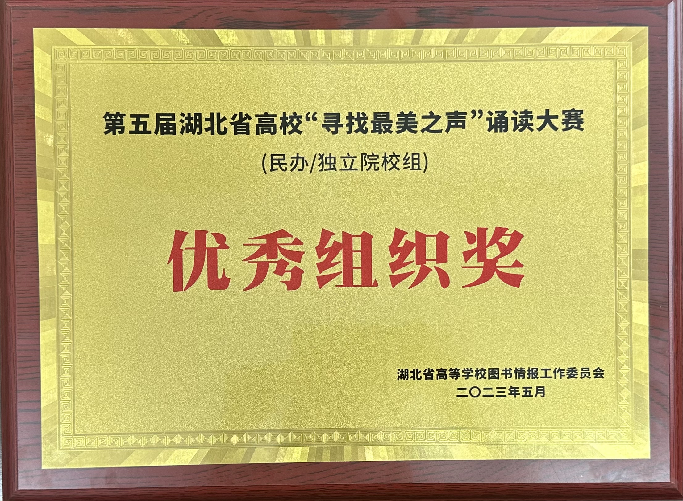 本网讯(通讯员 王会玲)为深入贯彻习近平总书记关于继承和弘扬中华优秀传统文化的指导意见,引导在校大学生深刻感悟习近平新时代中国特色社会主义思想的真理力量和实践伟力,5月19日,由湖北省高等学校图书情报工作委员会主办的“青春之声越百年”暨第五届湖北省高校“寻找最美之声”诵读大赛决赛在武汉大学图书馆总馆二楼学术报告厅圆满结束。全省70所高校参赛,我校图书馆荣获“最佳组织奖”。