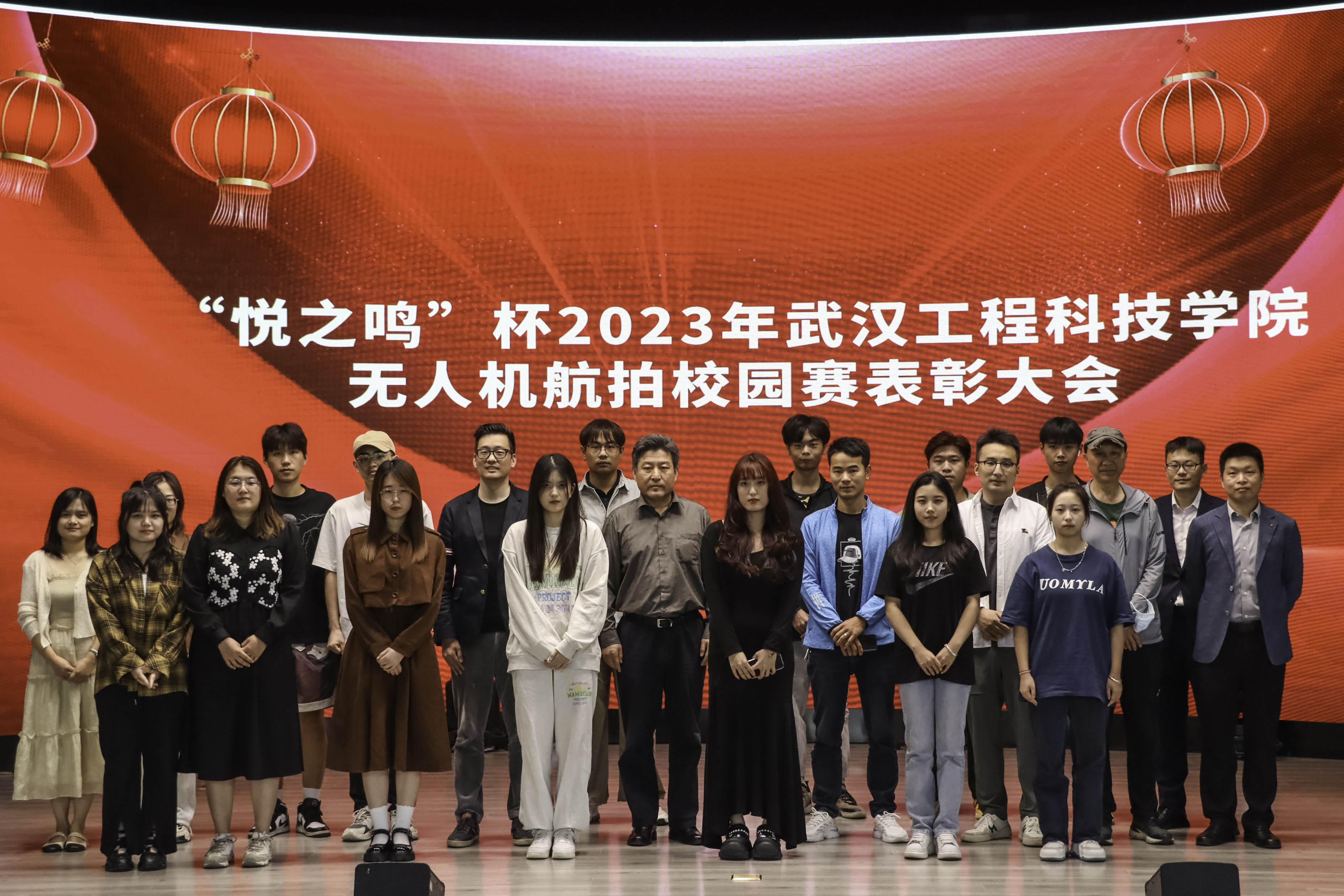 最后,全体领导嘉宾和获奖代表上台合影留念,至此,“悦之鸣”杯2023年武汉工程科技学院无人机航拍校园赛表彰大会圆满结束。