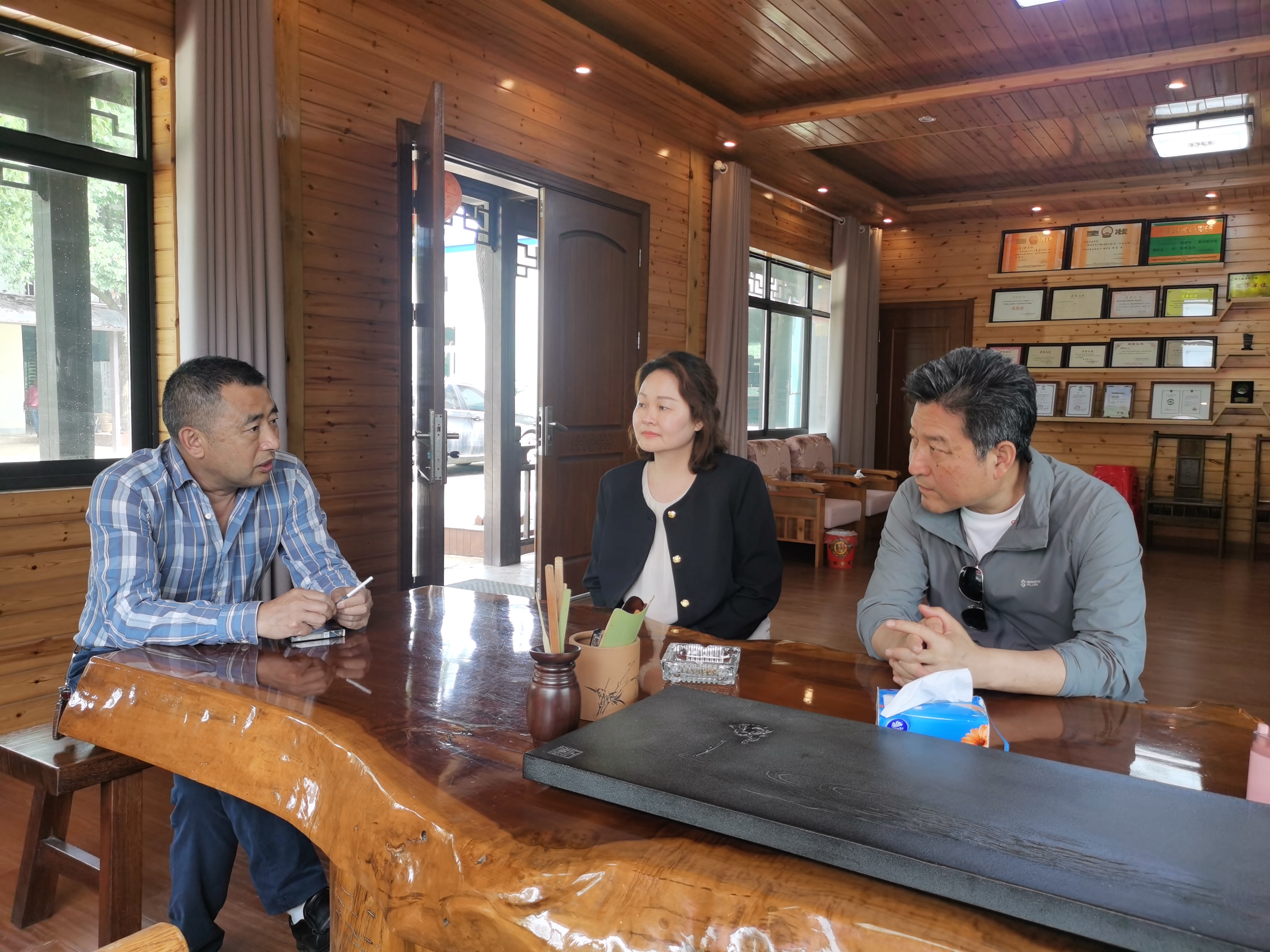 本网讯(通讯员 易葳)5月22日下午,我校党委常委、副校长杨伦带领乡村振兴学院相关工作人员前往位于江夏区乌龙泉街的武汉鑫碧舫生态果茶有限公司开展调研工作。该公司董事长金兴建向杨伦一行介绍了公司的主要产品、江夏碧舫以及公司的发展史。金兴建在谈及“江夏碧舫”名称的由来时说道:“江夏碧舫”茶属于炒青的绿茶,外形扁平光直,两头稍尖,泡在杯子里犹如绿色的小船在碧波中飘荡,形似月牙,又似高雅画舫,所以就叫“江夏碧舫”。