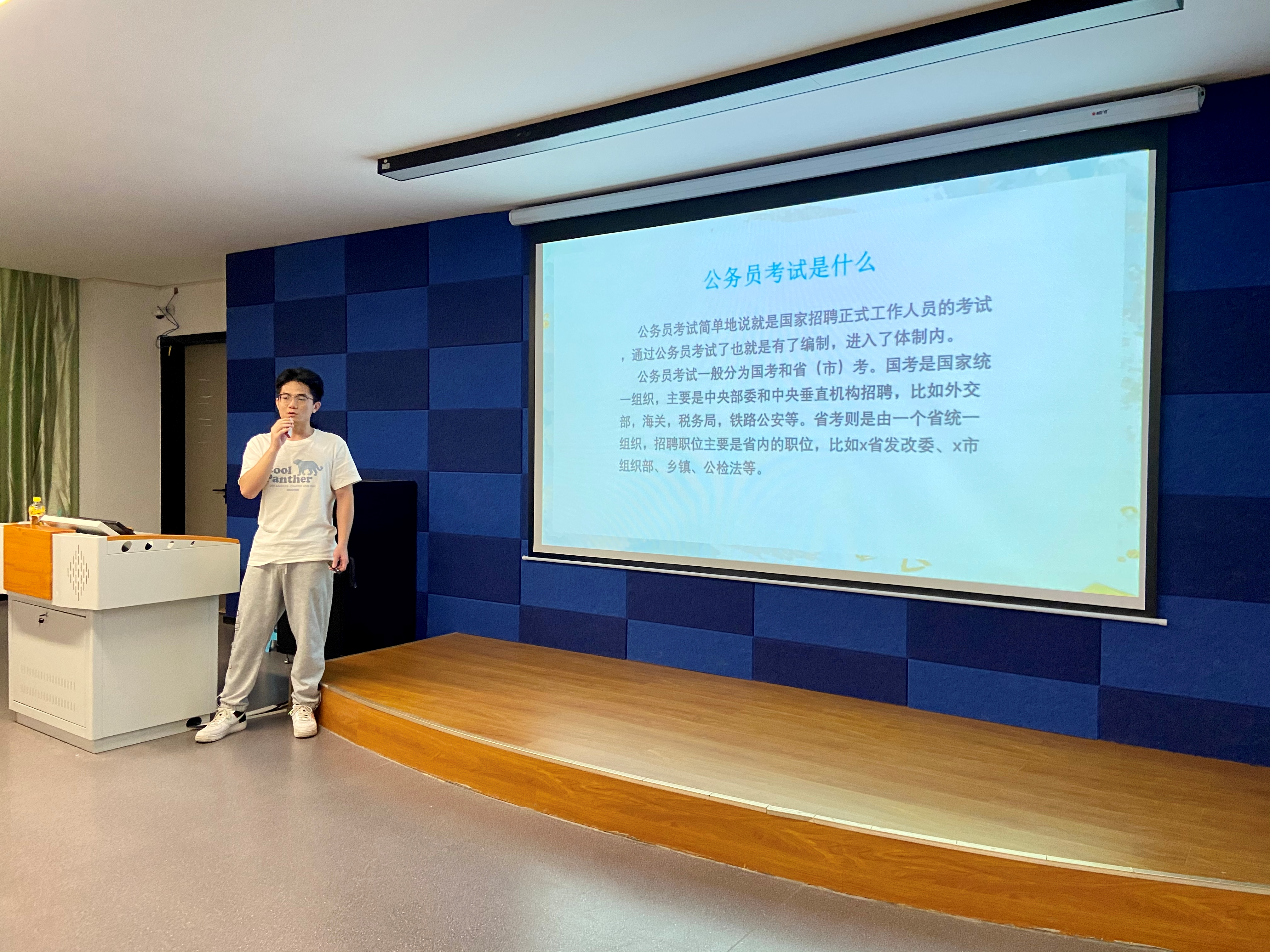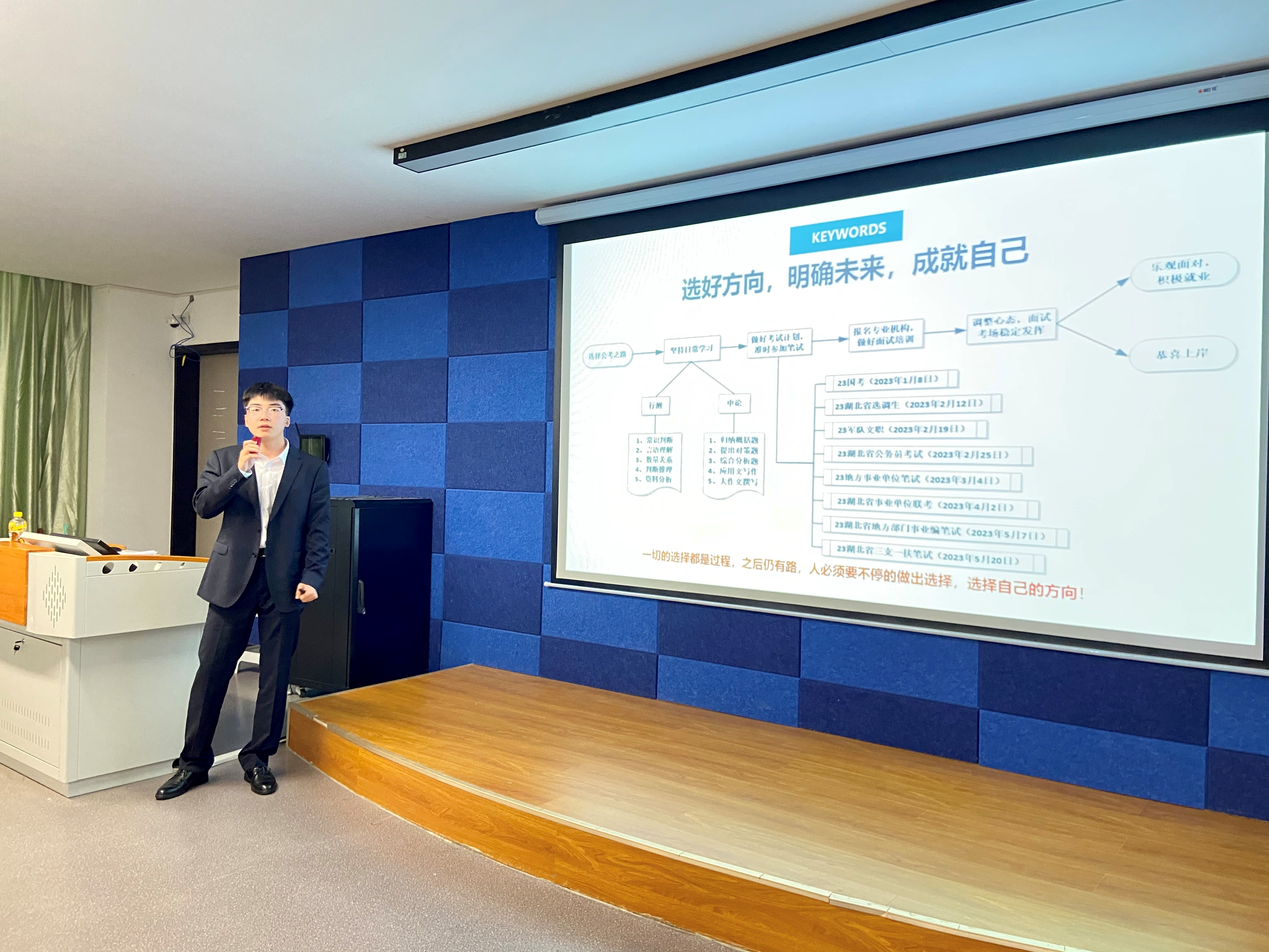 2位考公上岸的学生代表何甲培和张豪杰,围绕职业规划以及国家公务员考试内容做了全面的介绍和分析。讲述了国考、省考、选调生、三支一扶及其他公务员考试的区别、并对考试过程中行测、申论、面试技巧、心态调整等方面详细分享了自己的备考经验,让同学们对公考流程有了初步了解。同时,他们考公笔试和面试的方法与技巧,还从备考心态方面给予同学们许多帮助和启示。