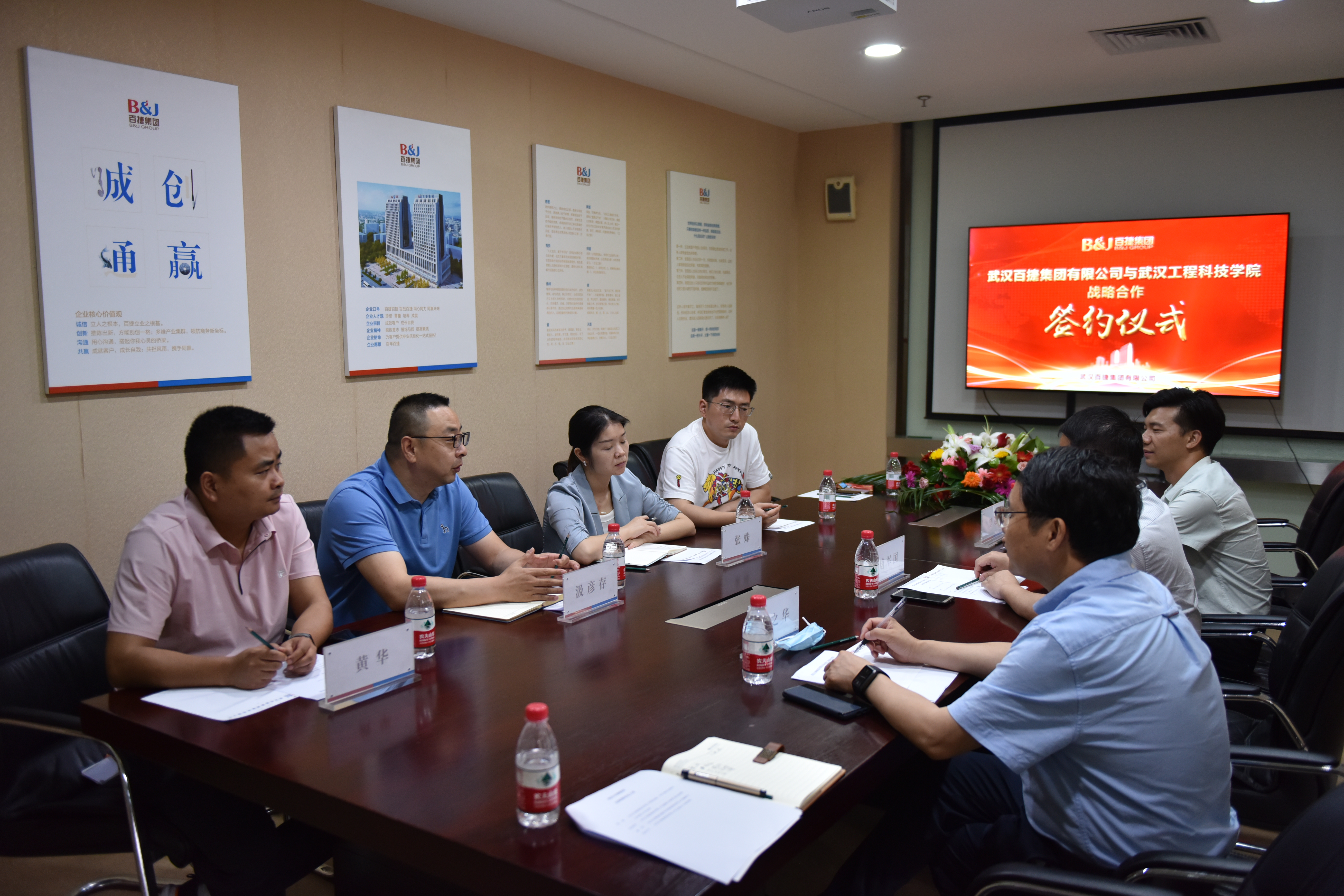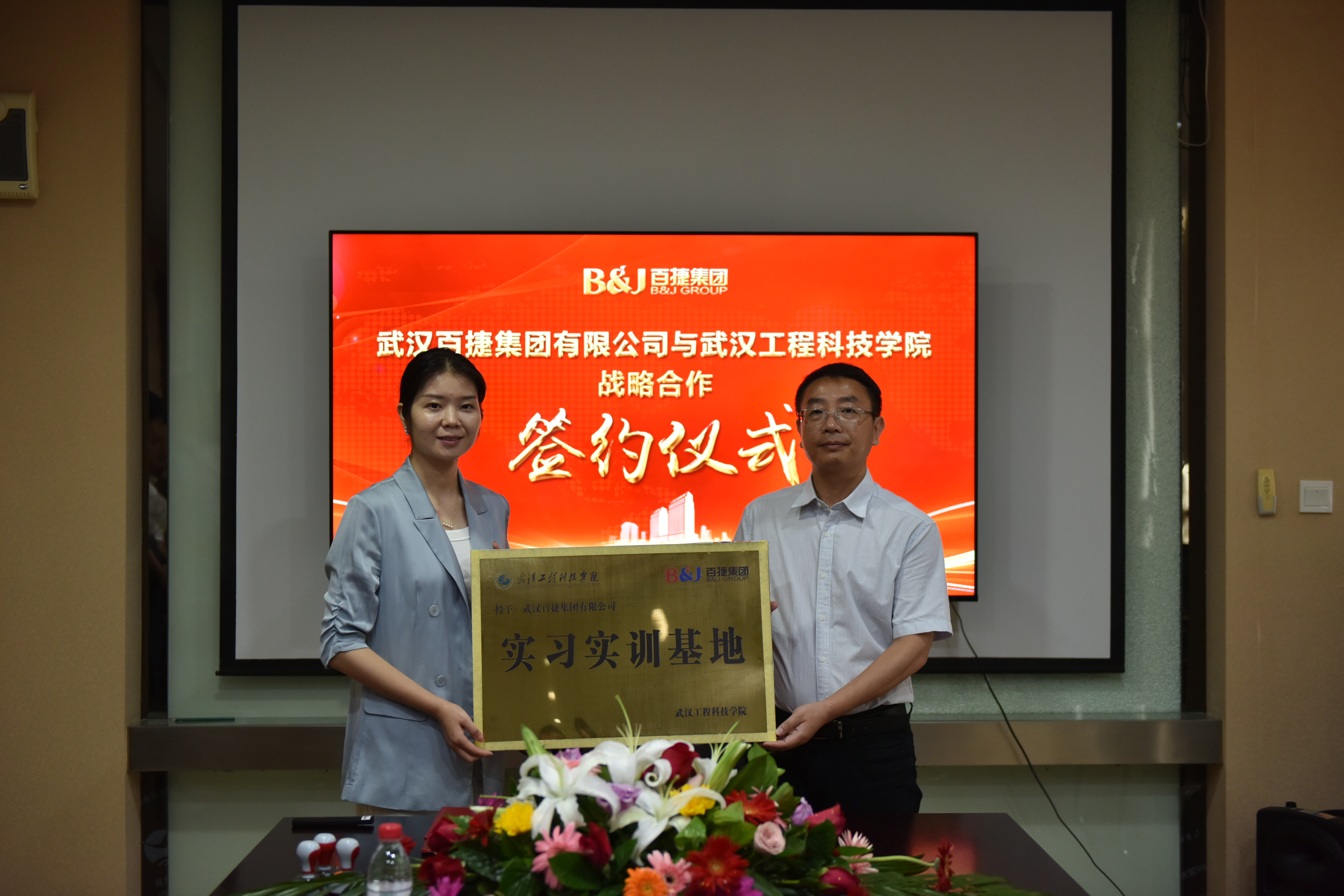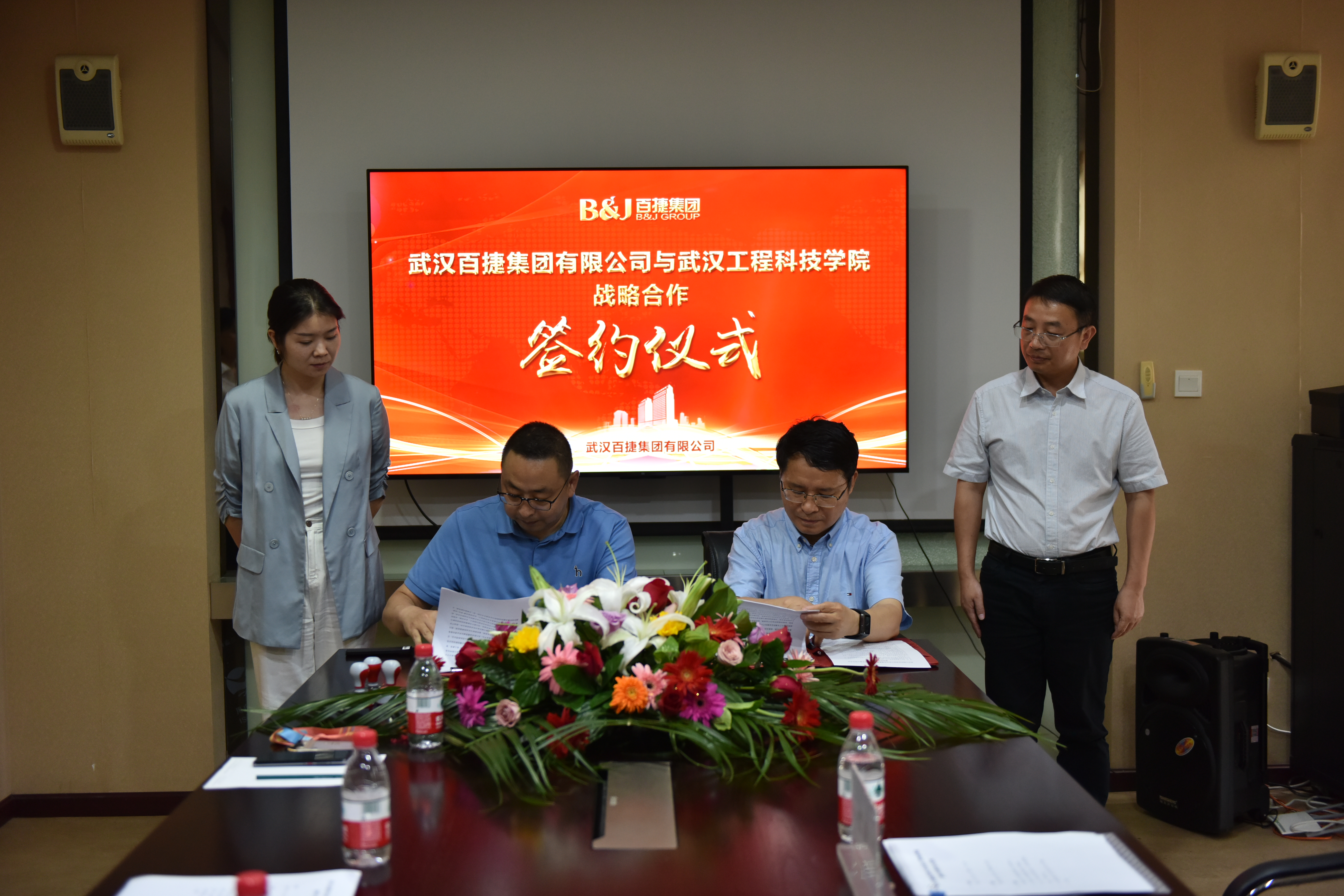 5月30日,武汉工程科技学院与武汉百捷集团有限公司战略合作协议签字仪式在百捷大厦董事会会议室举行。武汉百捷集团有限公司副总裁张姝、董事长助理汲彦存,学校党委副书记、校长助理唐军国,计算机与人工智能学院院长蔡之华等参加签约挂牌仪式。