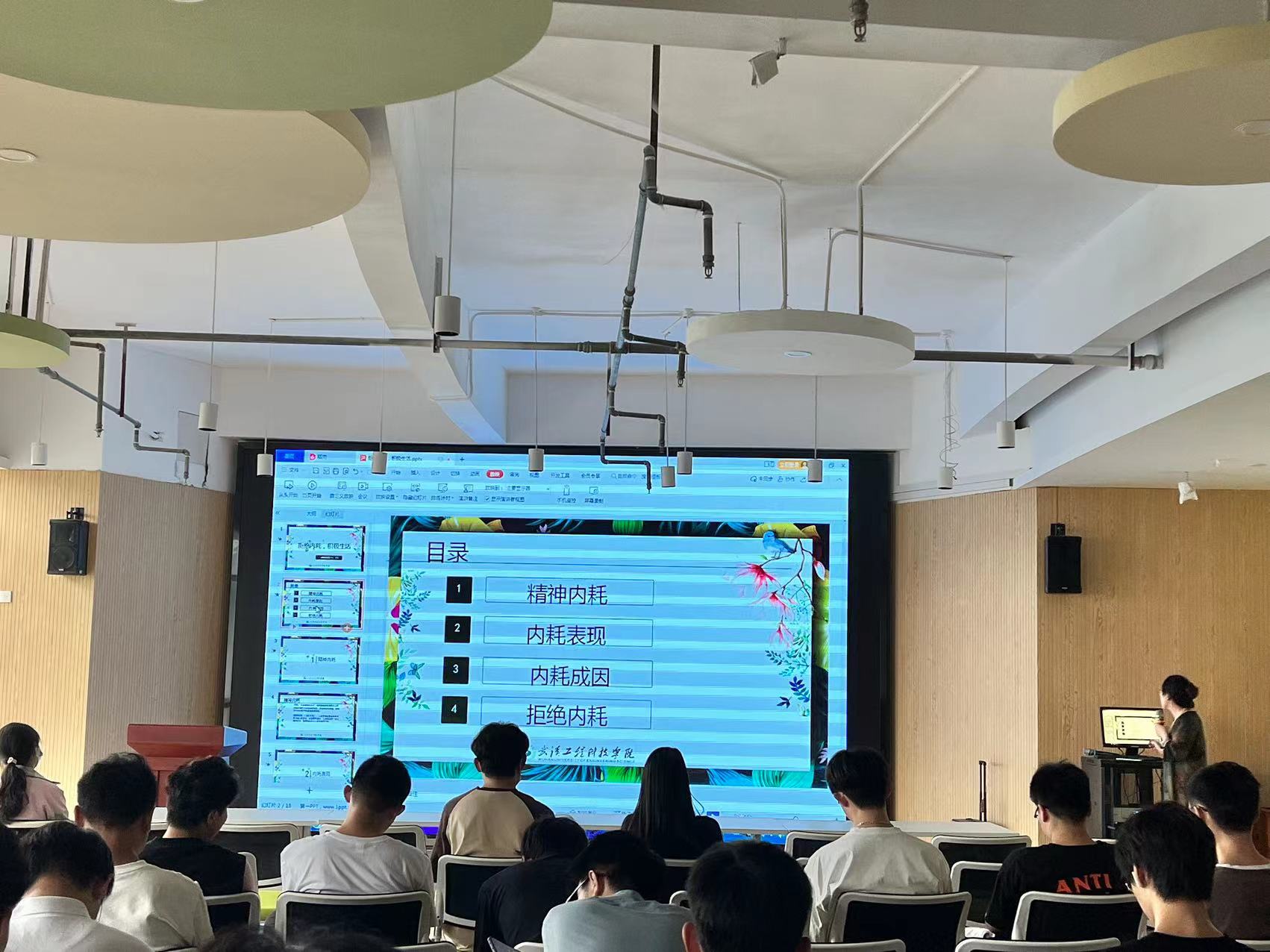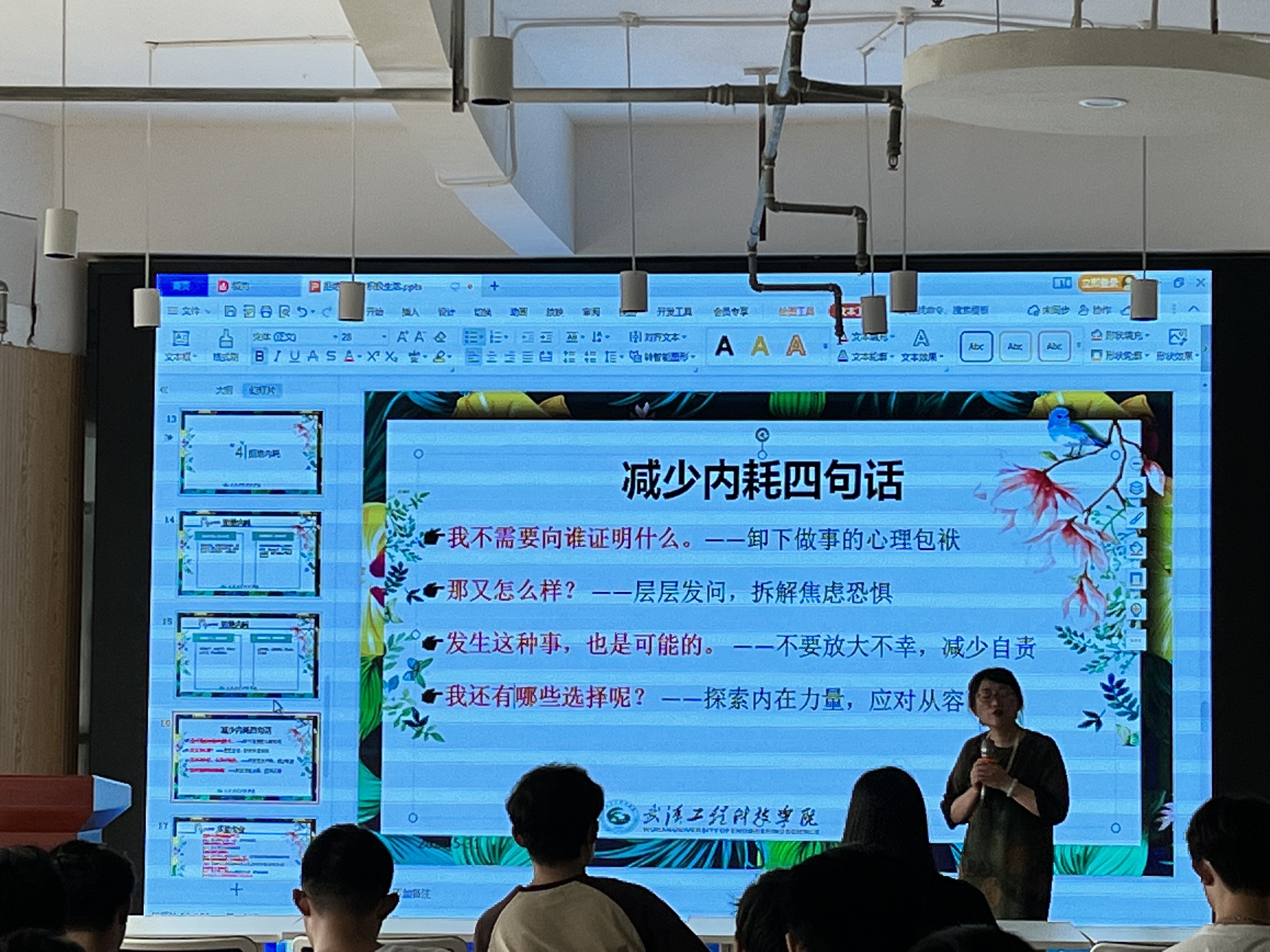 会议伊始,刘洁以“内耗”为中心,围绕着“精神内耗、内耗表现、内耗成因、拒绝内耗”四个方面进行重点阐述。她结合自身多年的工作经验与实际案例,为寝室长们重点强调,要关注当下,拒绝拖延,调整心态,积极面对未来的生活态度,以及如何通过种种内耗表现来排查重点人群、识别室友心理危机征兆、有效开展危机干预工作。