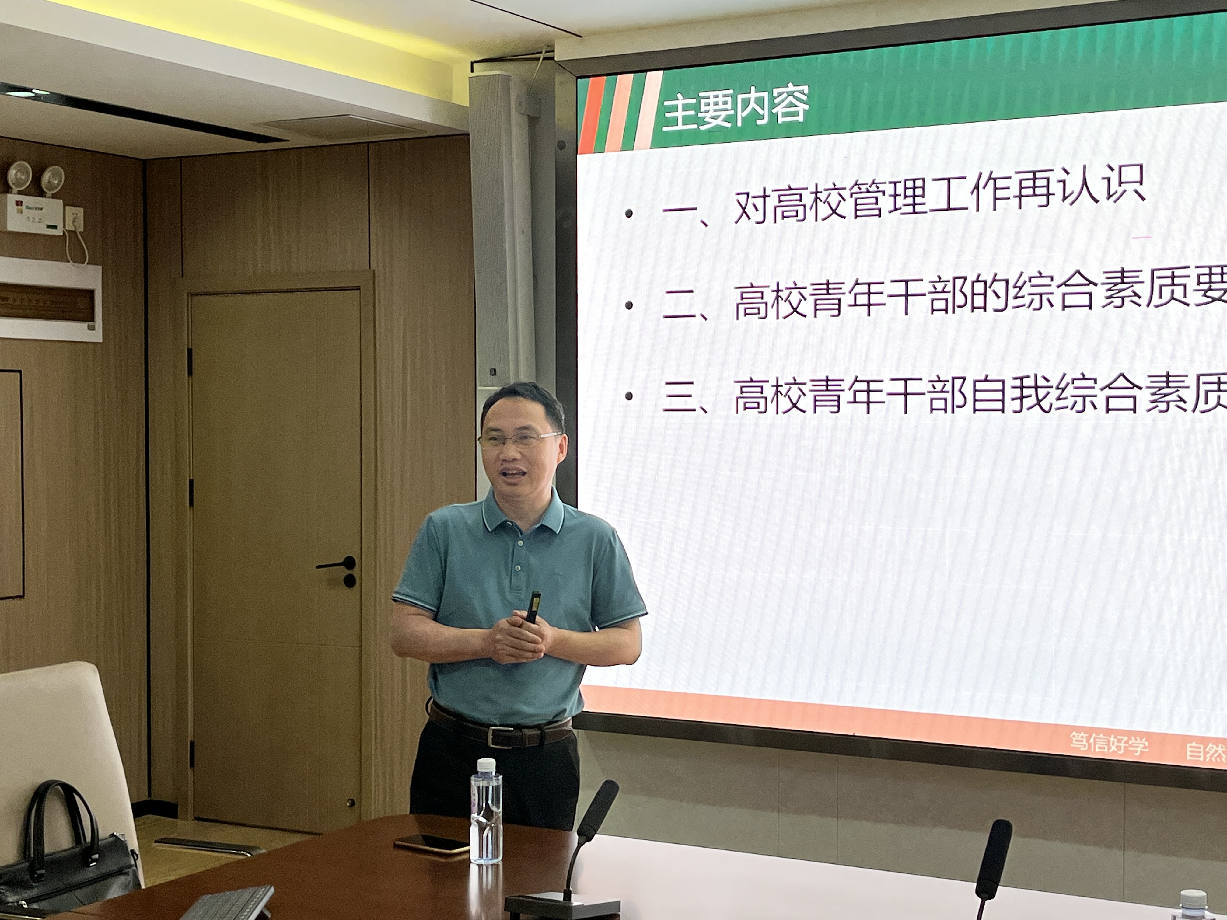彭庆军教授以《以职业精神从事工作 将事业理想融入工作》为题作主题报告,与大家一起分享高校青年干部综合素质提升的相关知识。他结合自身生长经历和工作经验,从对高校管理工作再认识出发,凝练了高校青年干部的政治素质和业务素质,并对高校青年干部自我综合素质提升提出了自己的建议。