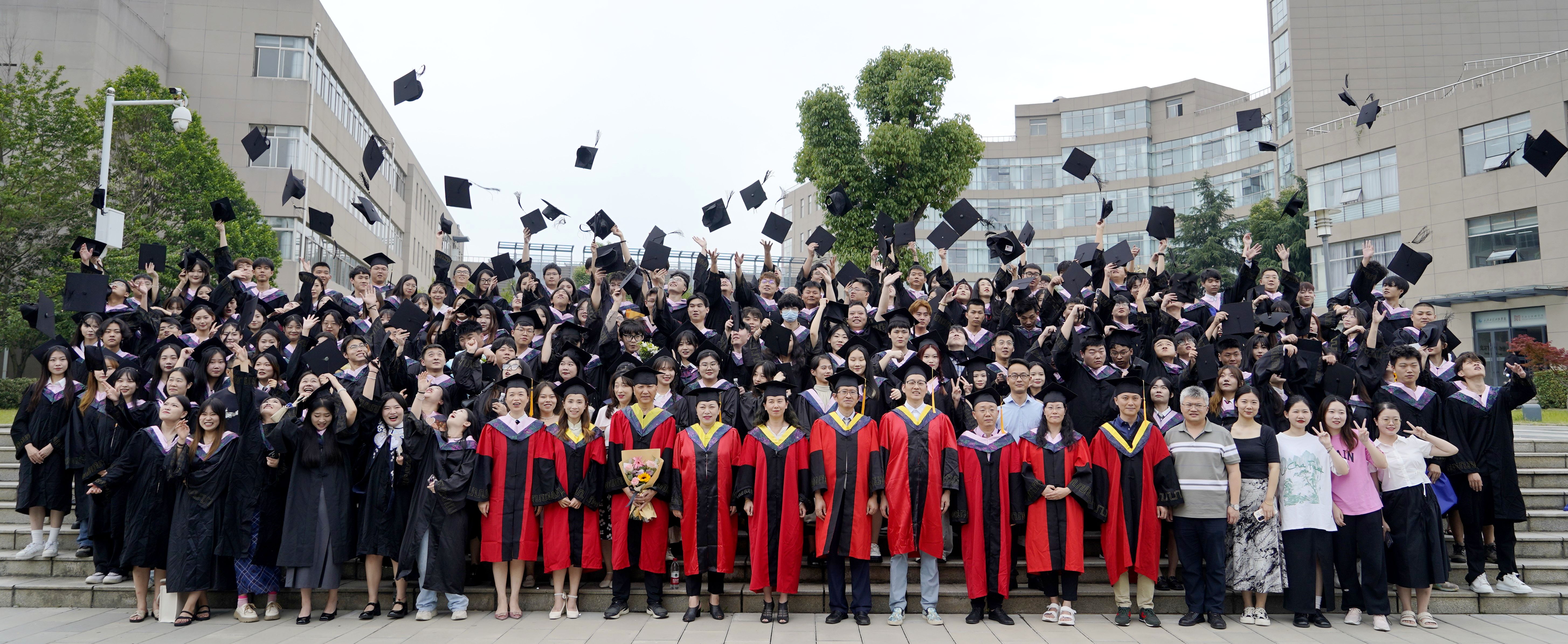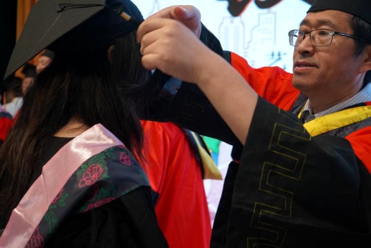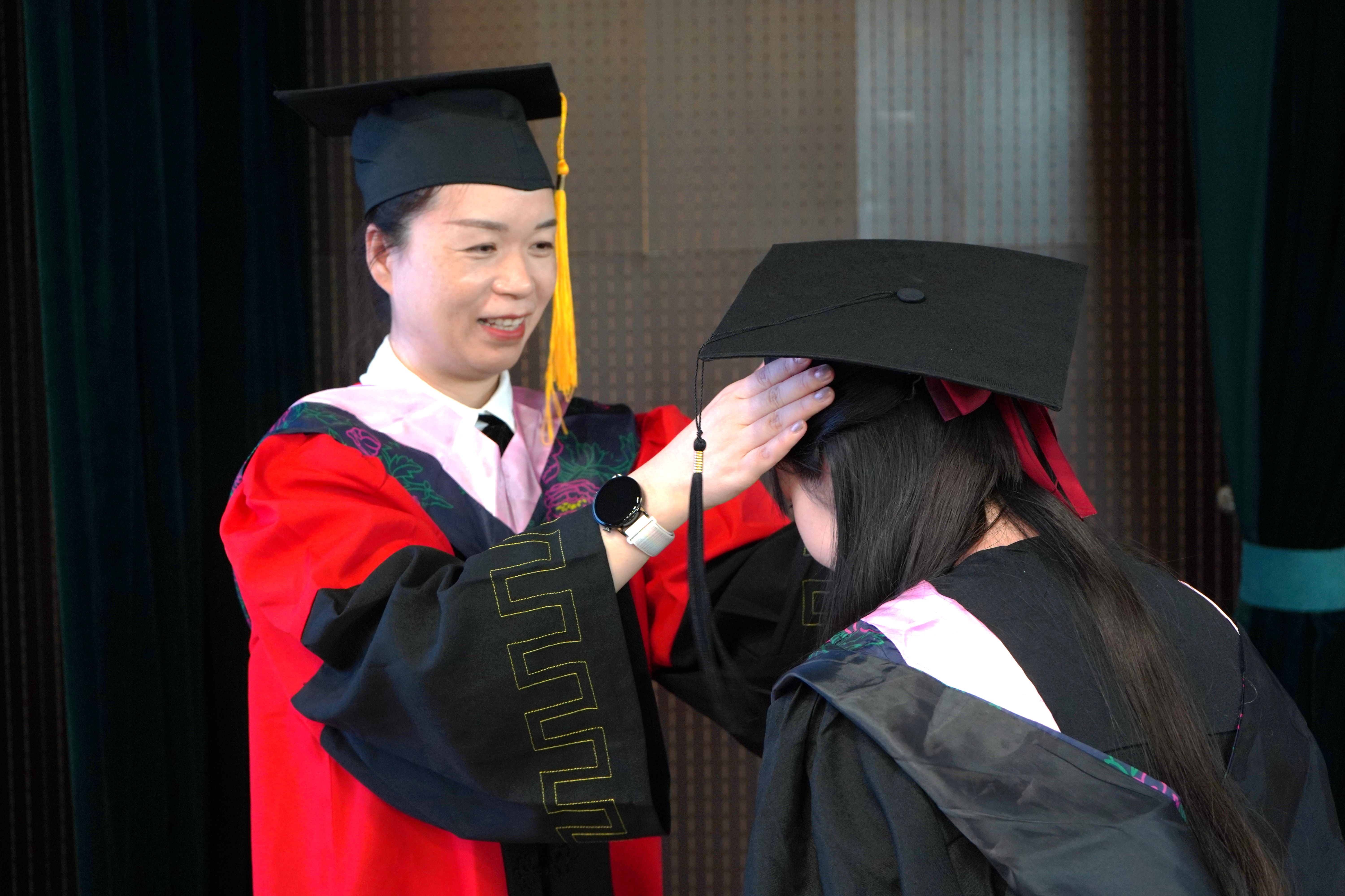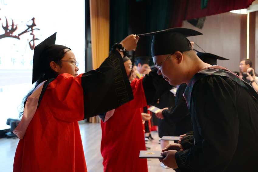 典礼最后,举行学位授予仪式。由领导、老师们为毕业生们正冠拨穗、颁发毕业证书和学位证书,并合影留念。