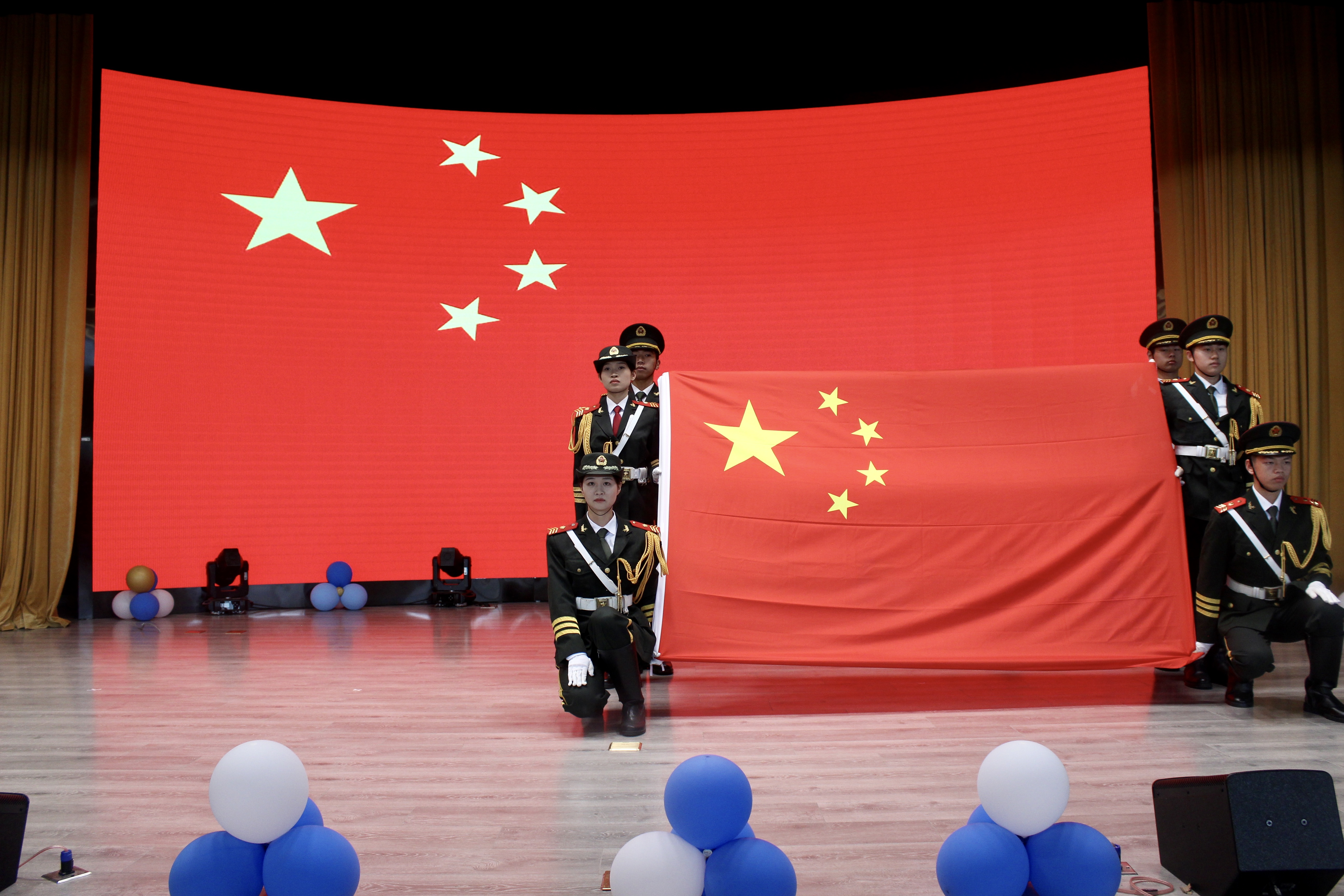 毕业典礼伊始,全体起立,奏唱国歌。