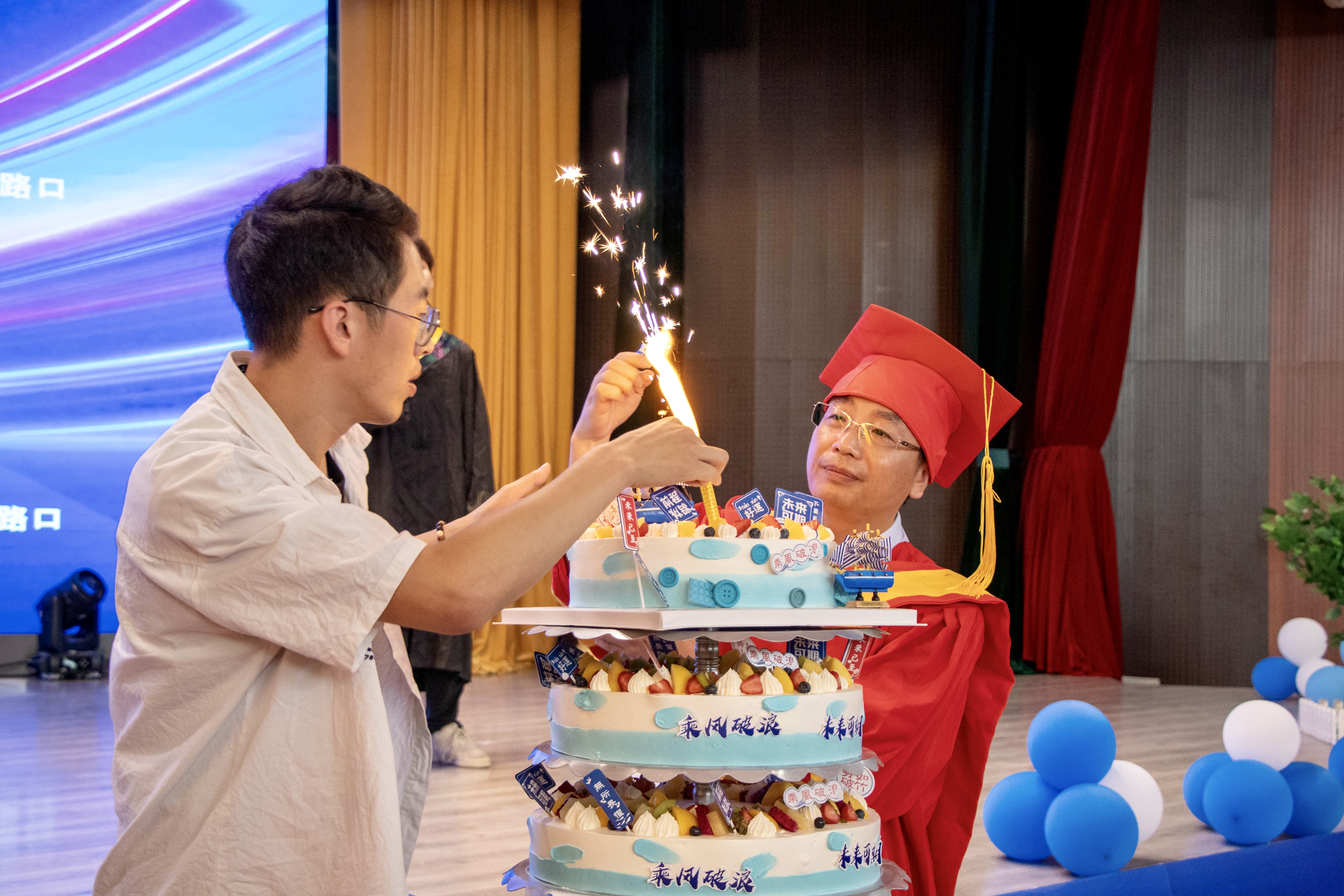 典礼最后,毕业班辅导员田鑫伟、曹雪莹、陈璐瑶、张萍、李欣怡为同学们带来歌曲《凤凰花开的路口》,同时推出了蛋糕,放出纸飞机,毕业典礼在温馨美好的氛围中圆满结束。