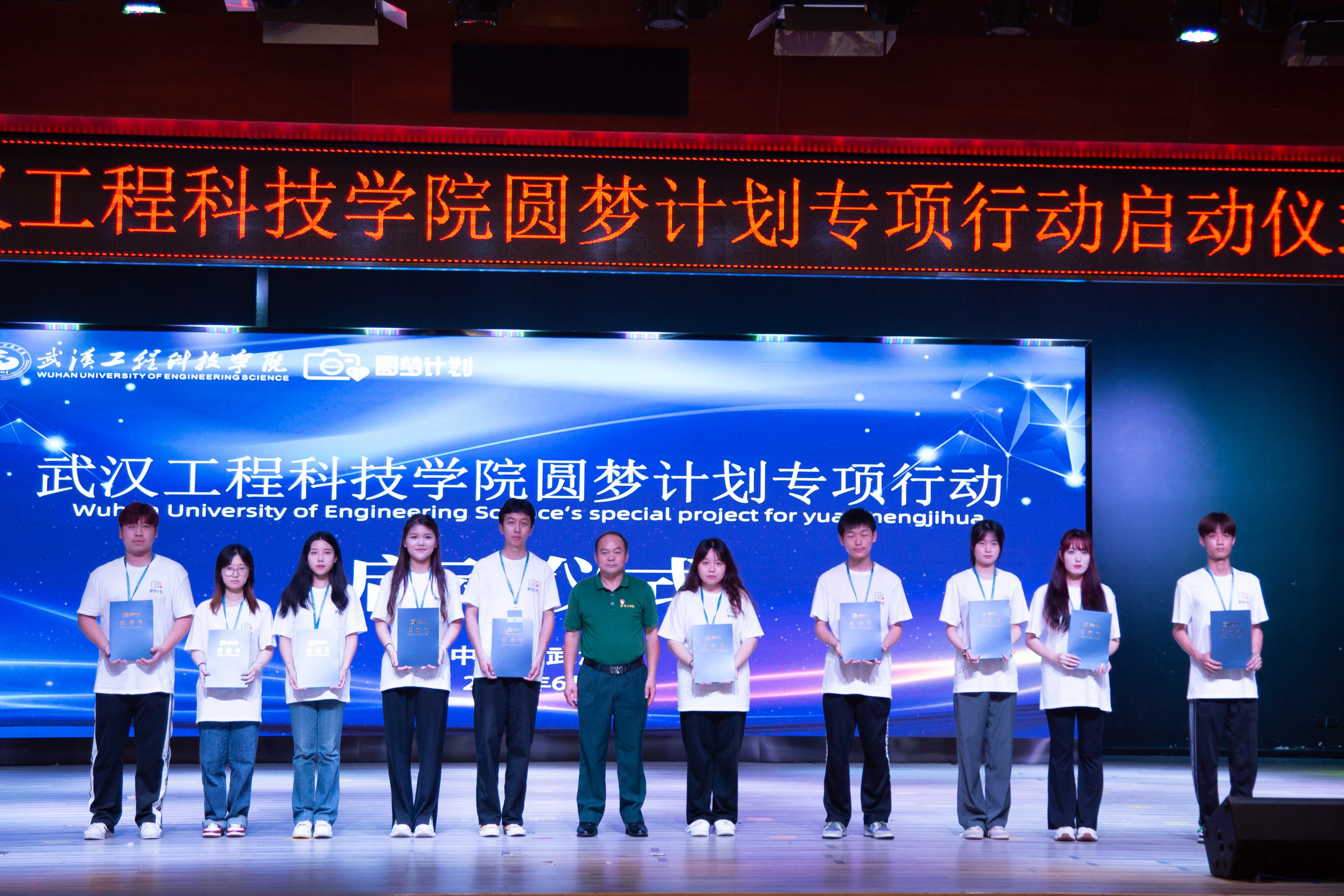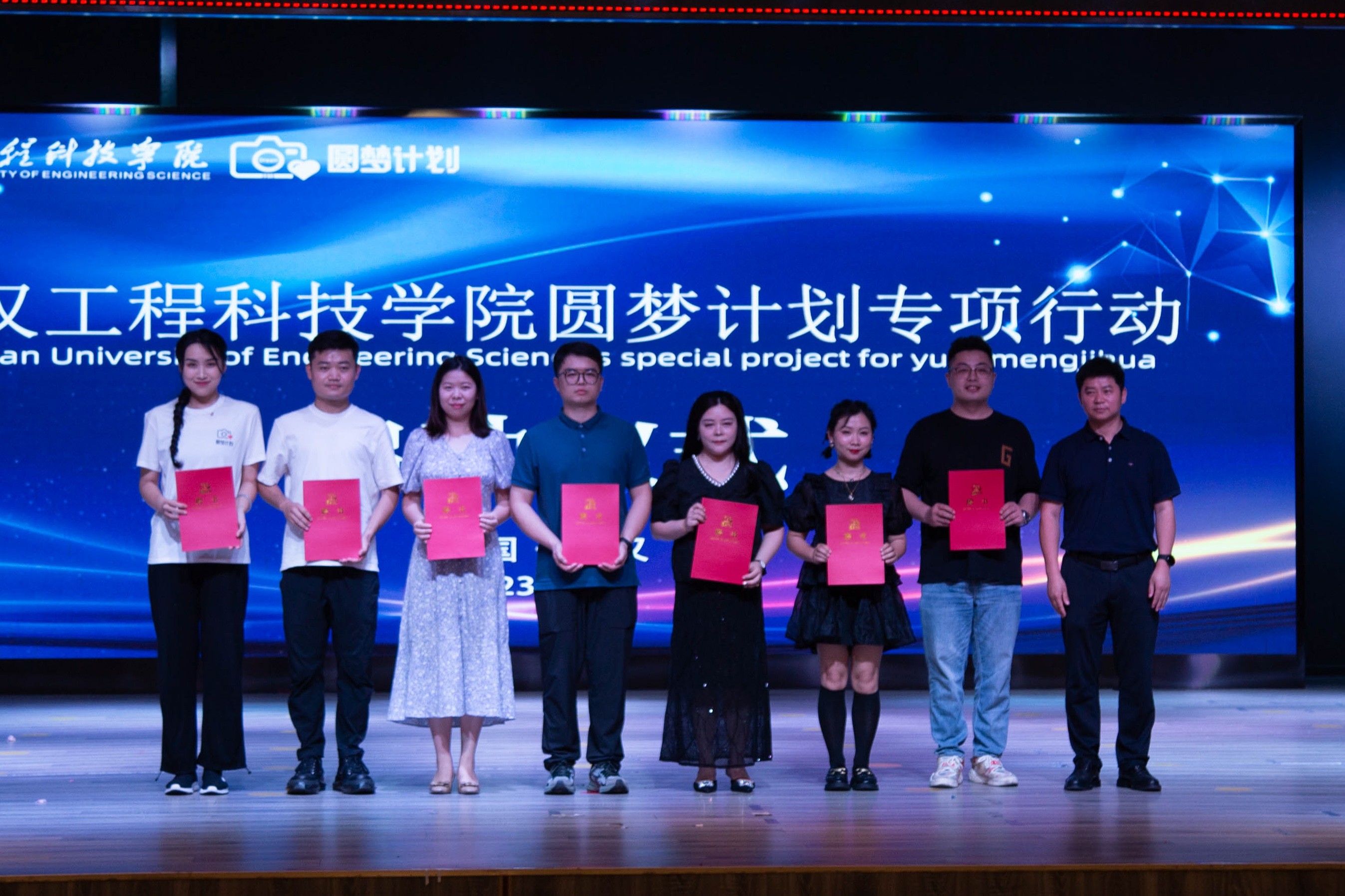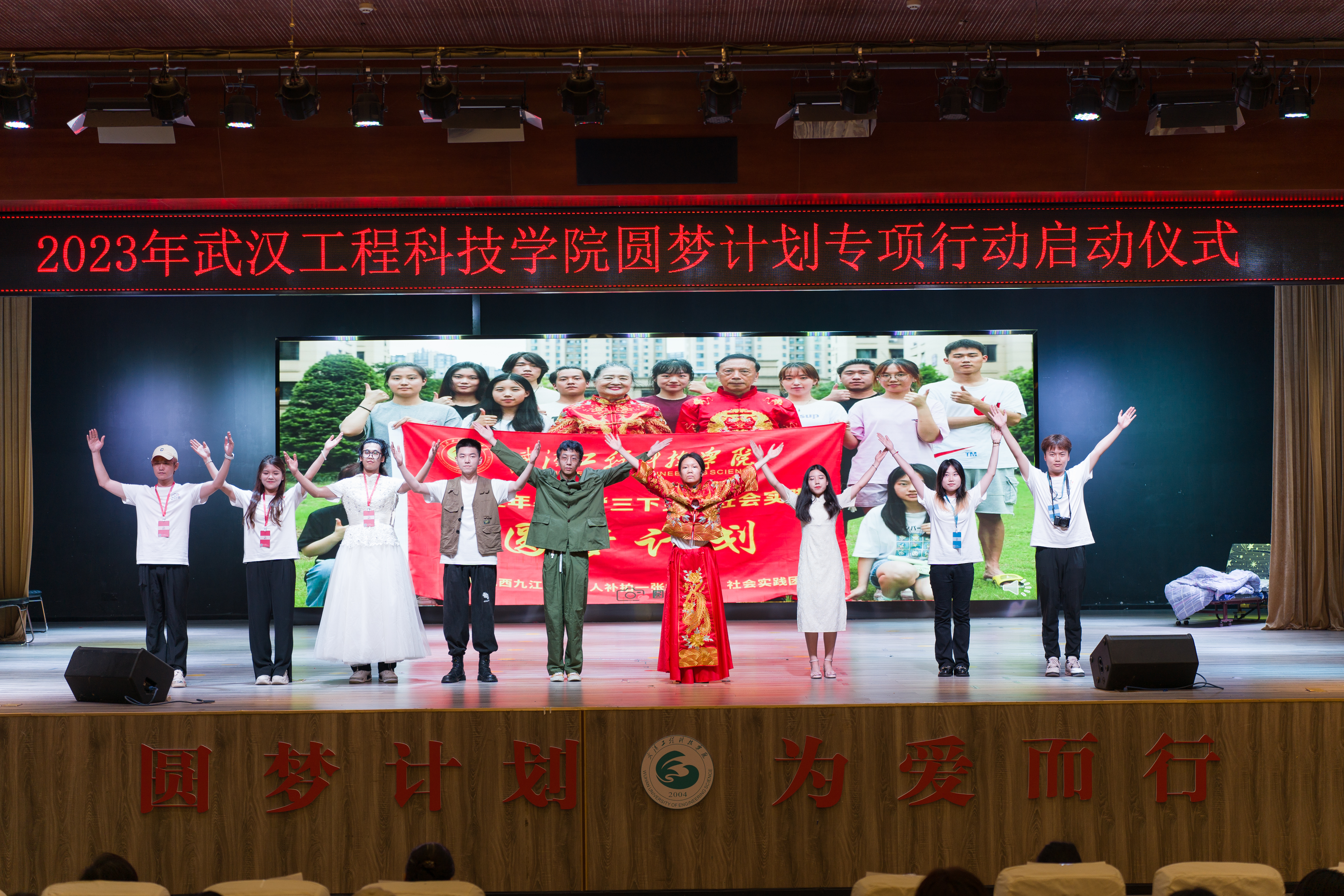 最后,在场领导嘉宾及圆梦计划全体队员上台合影留念,至此,2023年武汉工程科技学院圆梦计划专项行动启动仪式圆满结束。