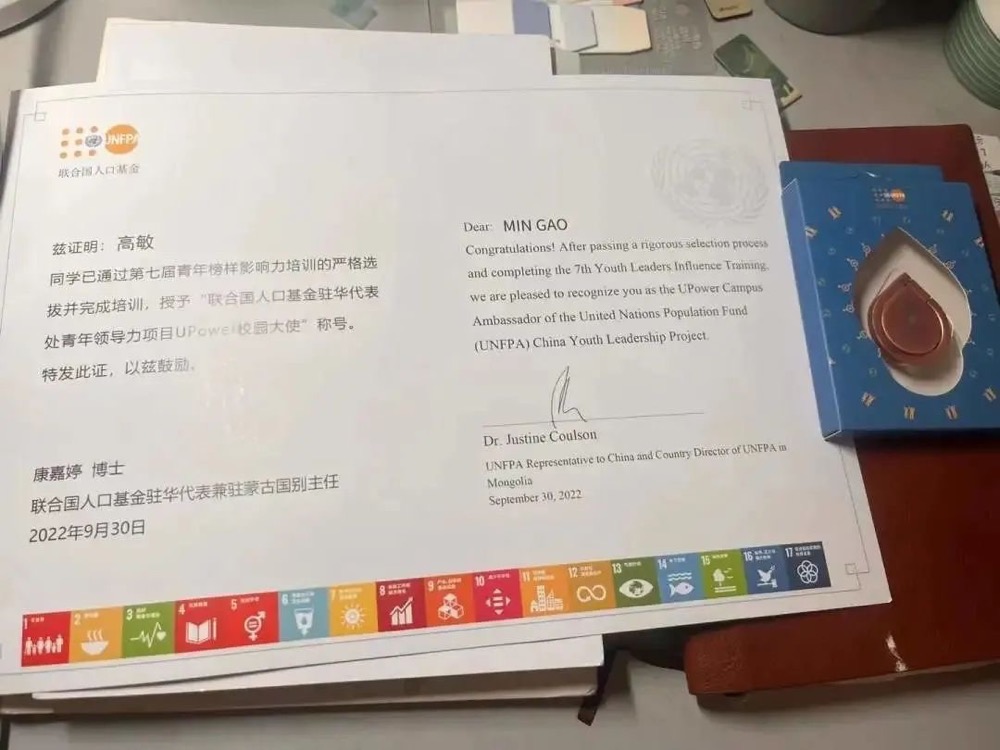 2022年6月在“联合国人口基金UPower计划:第七届青年榜样影响力培训”选拔中,经过层层选拔,高敏荣获最佳影响力奖项,并与其他校园大使一起参加线上培训,学习模拟联合国会议、英国议会制辩论等。来自各大高校的优秀校园大使汇聚于此,大家分组展开活动,高敏作为一组的班长,带领大家一起完成任务,大大提升了自身的组织沟通和协调能力。