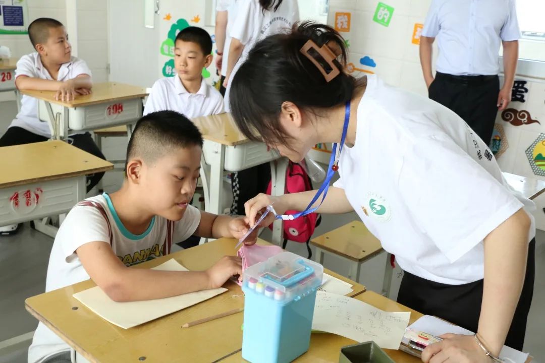 随后同学们进入课堂,即时开展活动。同学们拉着特殊孩子的手,向他们做自我介绍,与他们耐心交流。在课堂上给学生讲解了一些美术知识、绘画技巧,为下一步的后续工作做好铺垫。