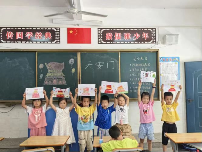 为弘扬革命文化,传承红色基因,心光梦志愿服务团队带领全体队员,组织开展兴国县潋江明德小学一二年级全体学生学习画天安门。每两个班组成一支小分队,同时,支教老师也带领学生合唱红色歌曲《红星闪闪》,在歌声中重温优秀事迹、领悟雷锋精神。通过开展红色专题课程,既丰富了同学们课余生活,又培养了他们的爱国主义情怀,让红色主义思想在学生们心中生根发芽。