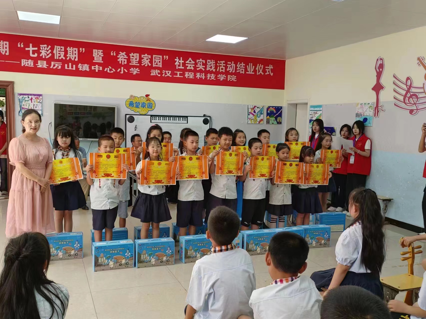 在支教志愿活动圆满结束之际,随县县委宣传部副部长熊长礼,团县委副书记邓鹏,厉山镇政府党委委员王松涛为“向阳花”爱心公益团队的9名大学生志愿者颁发志愿者荣誉证书,为志愿者们送上了诚挚的谢意,并表达了对他们辛勤工作和无私奉献的高度赞扬。