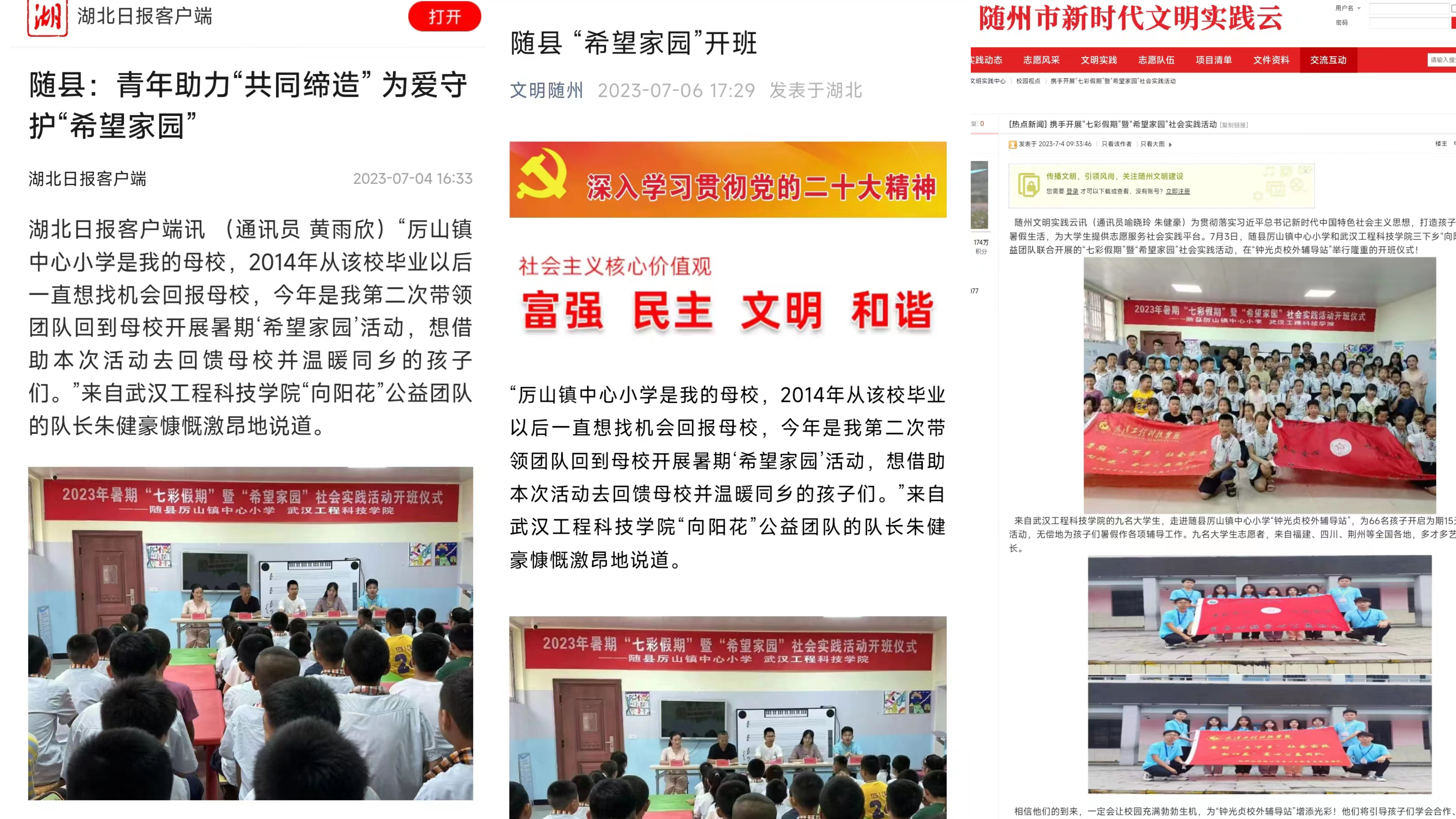 此次暑期“三下乡”支教活动,得到了《湖北日报》、《青春随县》、《青春随州》、《文明随州》、《随州市新时代文明云》等多家媒体的广大支持。短短两周内,支教队员与小朋友们从陌生到熟悉,建立起了深厚的友谊,“向阳花”爱心公益团队为小朋友带去知识与陪伴,小朋友也带给团队欢笑与感动,他们双向奔赴将“爱意”传递彼此,共同奏响新时代的青春赞歌。