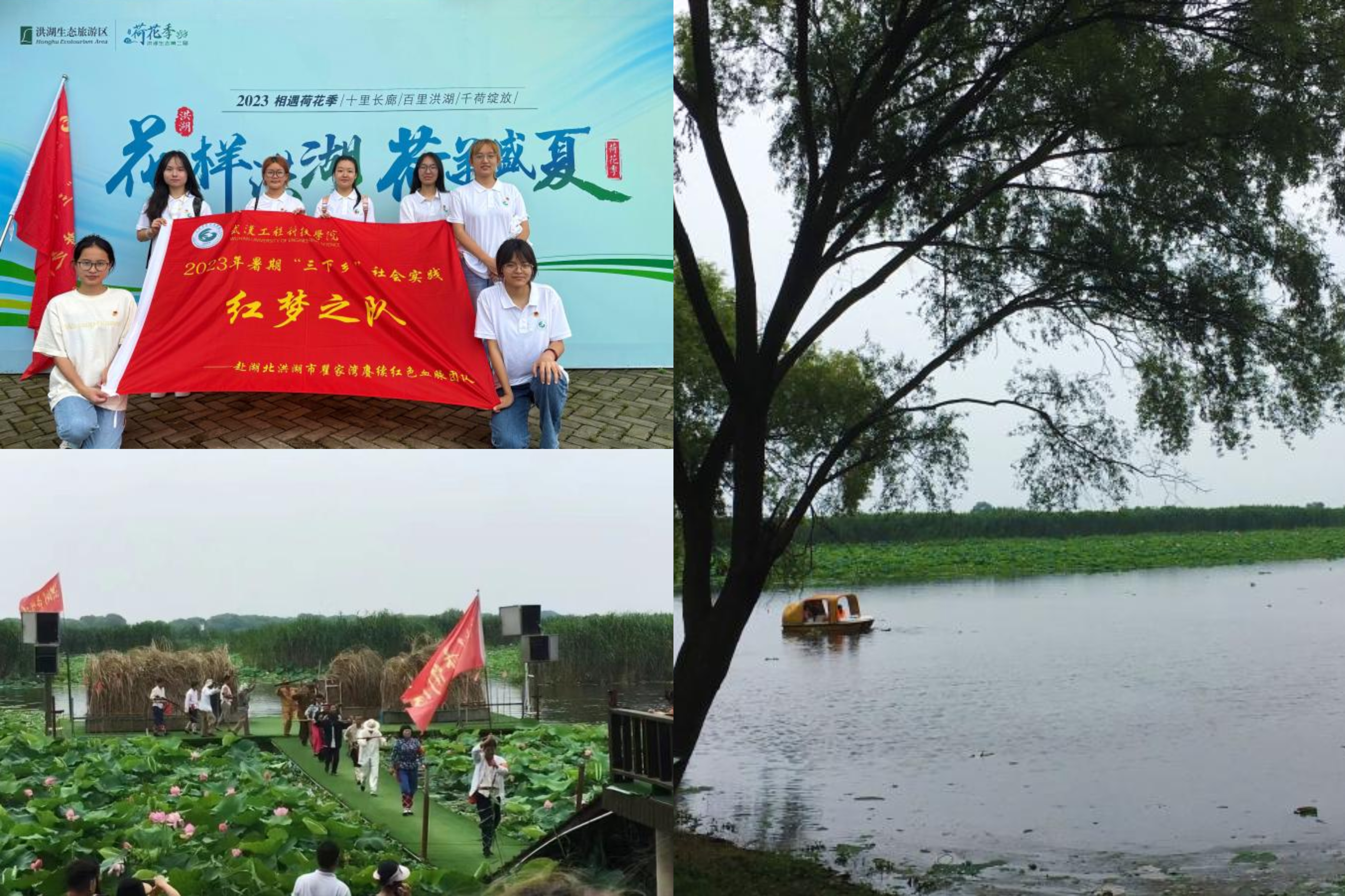 “洪湖水,浪打浪,秋收满畈稻谷香,人人都说天堂美,怎比我洪湖鱼米乡。”团队成员随着张伟的脚步一同来到了洪湖岸边,乘着快艇,真切感受了一把什么叫“洪湖水,浪打浪”。等身后的激起的水花渐渐消散,大家来到了一片壮观的荷花景区,这里荷花成片,有古旧的游客小火车在荷花池旁缓缓开过,在这里,心灵会不由静谧。随着“枪声”的响起,是表演人员为观赏者重现《洪湖赤卫队》中的经典片段,在这里,团队成员再次和那段战火纷飞的岁月相逢。