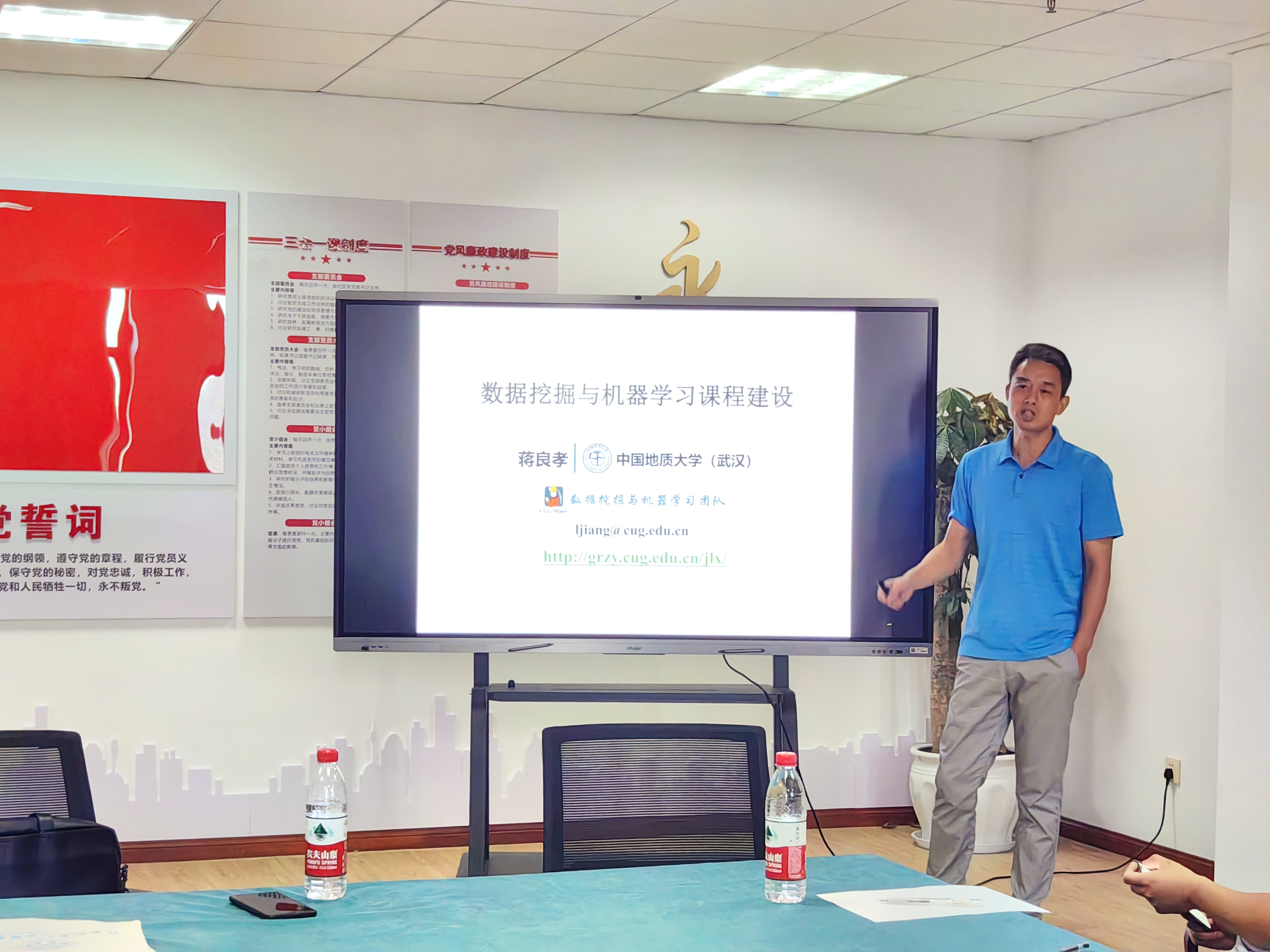培训会上半场由中国地质大学(武汉)的蒋良孝教授向青年教师们分享了《数据挖掘与机器学习》的课程建设经验。从课程发展、教材选择、内容分布、课时分配及考核方式等方面向青年教师们介绍了一门课程从无到有再到精的建设及发展历程。最后,他向青年教师们提出了“做个有心人,教、研二合一”的宝贵建议。