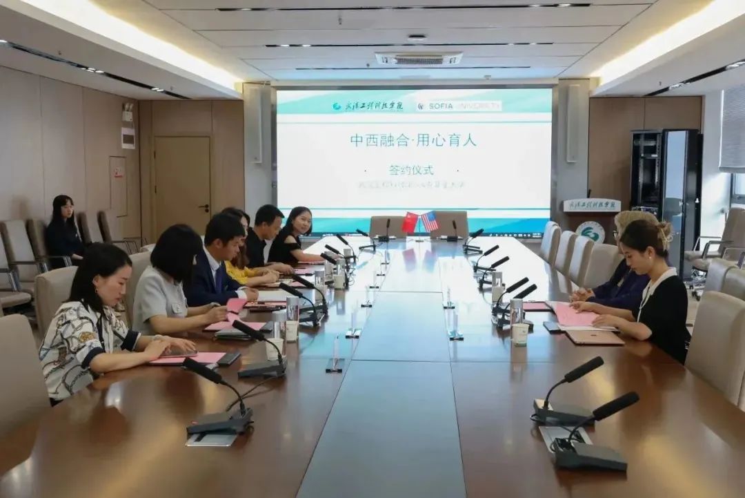 武汉工程科技学院与索菲亚大学在学校综合楼1210会议室举行签约仪式。索菲亚大学校长Dr.Carol Humphreys,全球学院高级总监王雅俐,武汉工程科技学院副董事长、党委副书记、常务副校长王加青,党委常委、校长助理胡晶晶,党委常委、校长助理赵欢,国际教育学院副院长郑锋、彭娟出席会议。