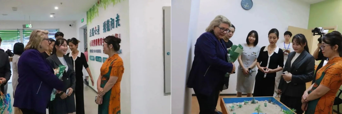 讲座结束后,在学校师生的陪同下,Dr.Carol Humphreys一行参观了学校大学生心理健康中心,大学生心理健康中心主任刘洁陪同参观讲解。在沙盘室、情绪宣泄室及五感花园的参观中,Dr.Carol Humphreys对此产生了浓厚的兴趣,她表示,通过这些有趣的方式减轻学生们的心理负担,帮助他们成为更好的自己是非常正确的。