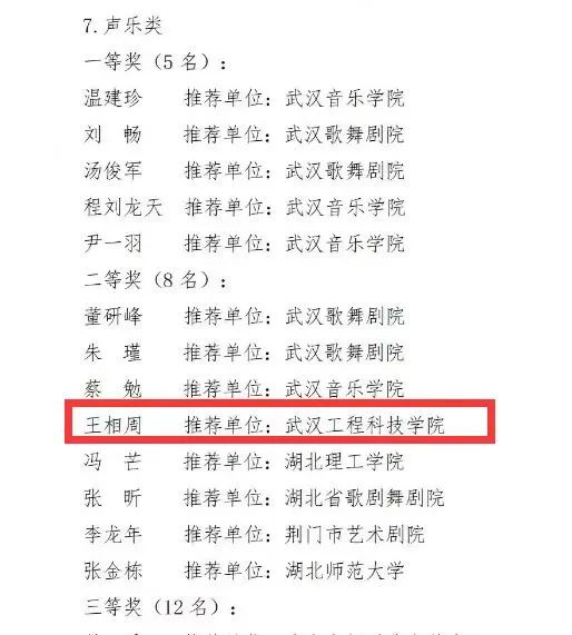 近日,由中共湖北省委宣传部、湖北省文化和旅游厅、湖北省人力资源和社会保障厅、湖北省文学艺术界联合会联合主办的湖北省中青年艺术表演人才大赛暨新人新作展演(决赛)获奖名单公示,武汉工程科技学院教师王相周荣获声乐类二等奖。