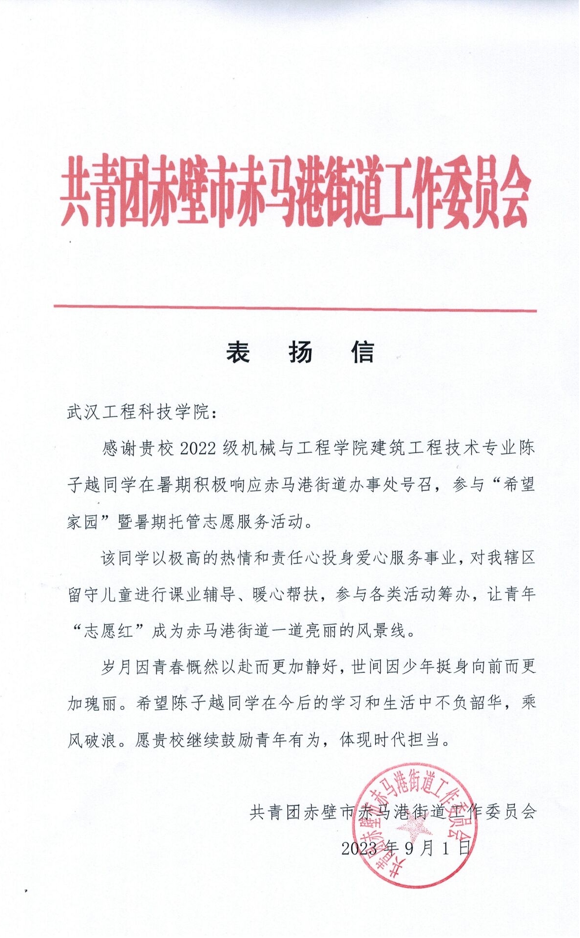 本网讯(通讯员 肖萌)近日,学校收到一封来自赤壁市赤马港街道工作委员会的表扬信,信中对我校机械与工程学院22级建筑工程技术专业陈子越同学在暑期积极响应赤马港街道办事处号召,参与“希望家园”暨暑期托管志愿服务活动中的表现给予高度肯定和赞扬。