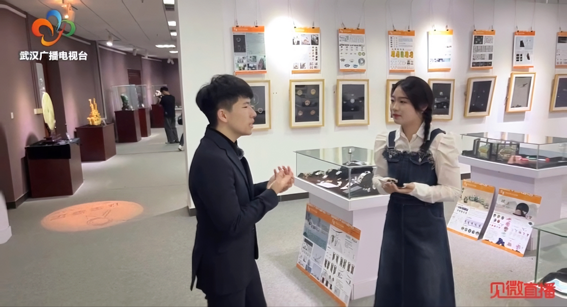 最后,在直播的尾声,镜头随着记者王艳雪,走进了艺术与传媒学院珠宝展厅,展厅内陈列着往年优秀毕业生的作品设计,供学生们学习。