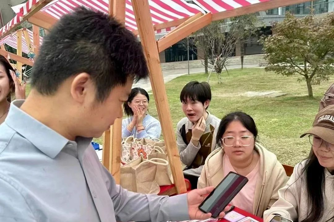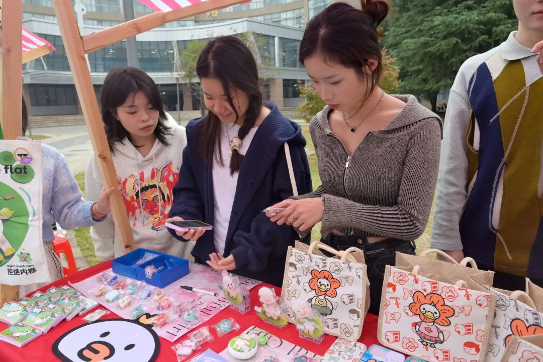 本次文创潮玩周包括潮玩集市、创业工坊、文创成果展三部分。潮玩市集内商品琳琅满目,人潮拥挤,热闹非凡。现场有香水小摊、粘土自制品、手绢、首饰设计作品、风景卡片等,过往师生纷纷驻足围观欣赏,并购买相中的产品。