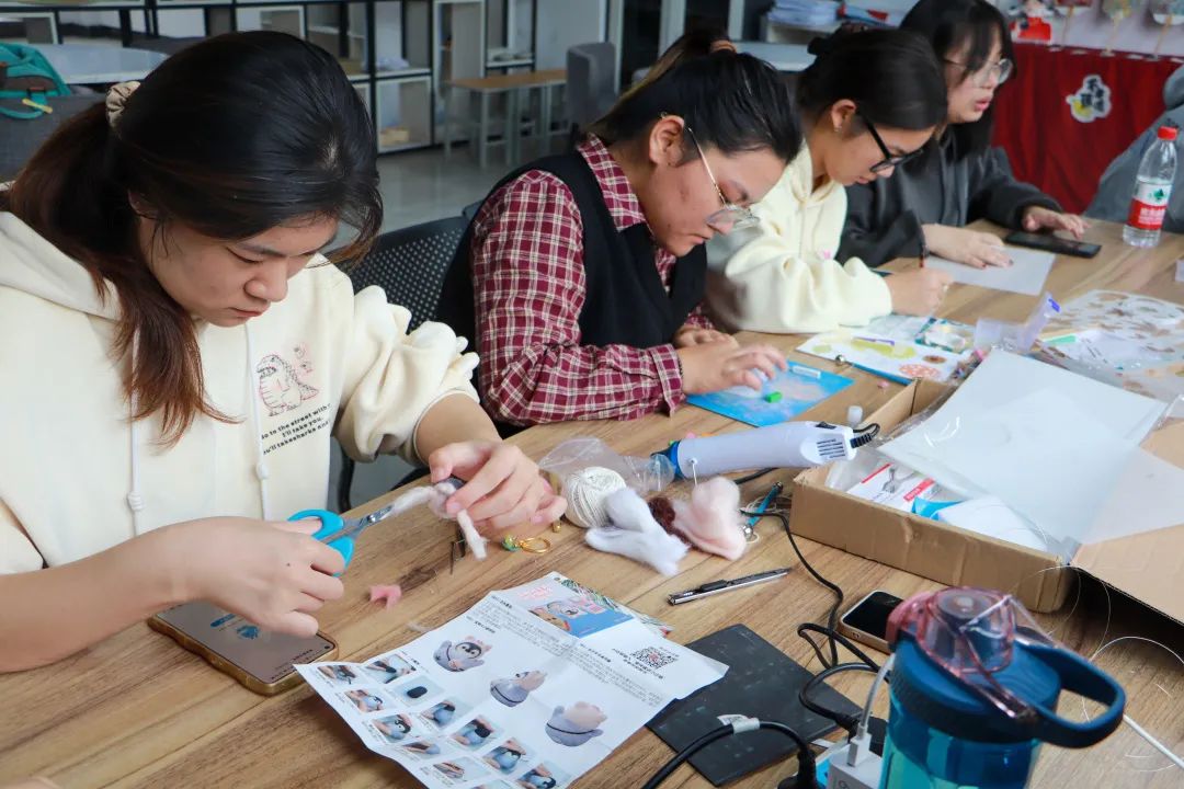 创业工坊内的桌柜上摆放着学生们琳琅满目的工艺品,如色彩鲜活的彩瓷、富有创意的抱枕、融合民族色彩的荆楚文化手绢……还有学生进行现场展示,有的同学低头制作着羊毛毡娃娃,有的同学在制作精美的漆艺纸扇,还有的同学绘制了精妙严谨的设计图纸。