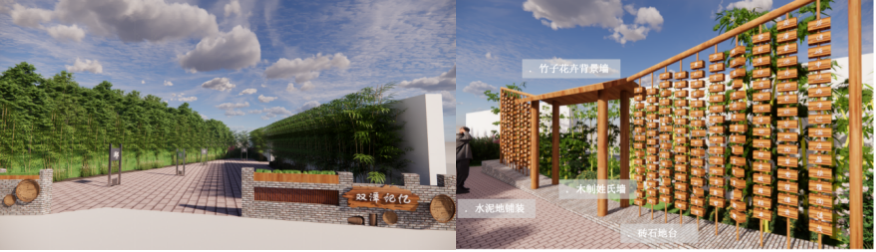 村口闲置空间改造,采用新旧材料结合,赋予乡村记忆。定制的姓氏牌标识,记录着双潭村的姓氏文化,进入空间的人们可以体验到承载双潭记忆故事。同时还根据双潭村的传说“金牛浴成”,运用生动的“金牛”造型打造双潭村“IP”标志,以展示双潭村村民坚毅勇敢、勤劳诚实的性格品质。