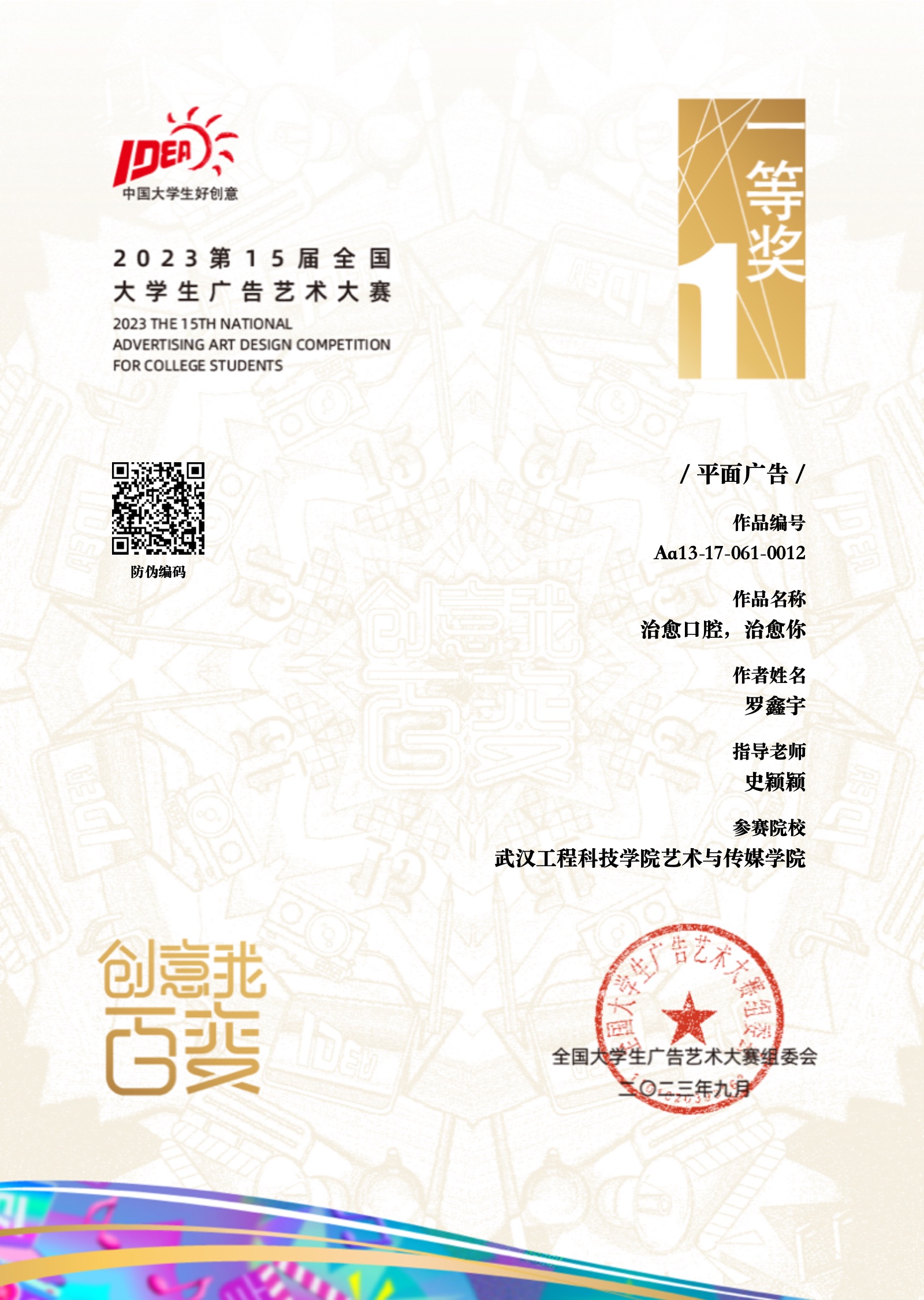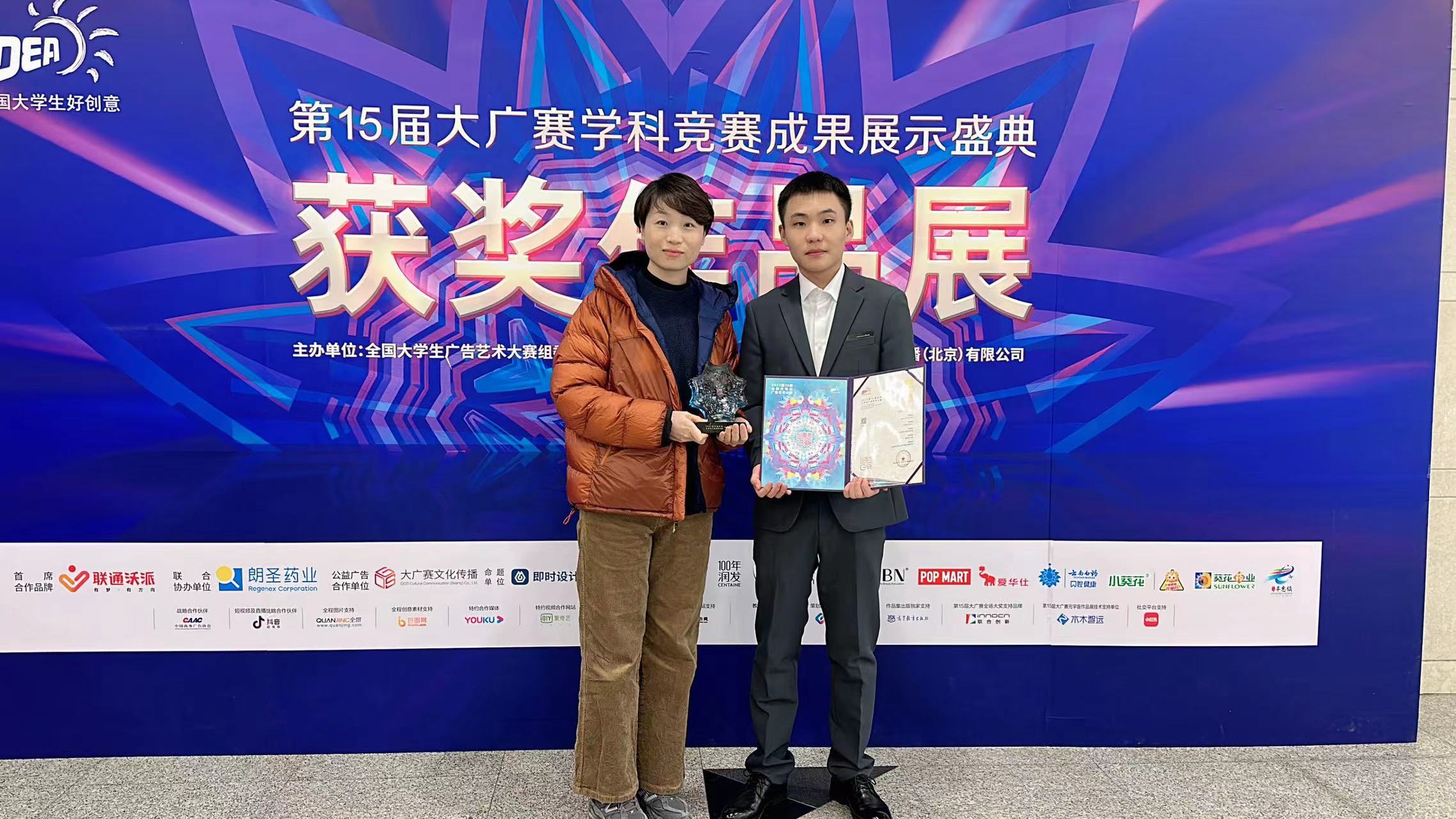 11月25日,第15届大广赛学科竞赛成果展示盛典在北京市中国传媒大学礼堂隆重举办。在此次赛事中,我校艺术与传媒学院学子凭借出色的创意和扎实的技能,在平面广告作品类首次荣获全国一等奖的优异成绩。国赛一等奖作品《治愈口腔,治愈你》的作者21级视觉传达设计专业学生罗鑫宇与其指导教师史颖颖应邀参加了本次颁奖典礼,与其他获奖选手共赴此次创想之约。