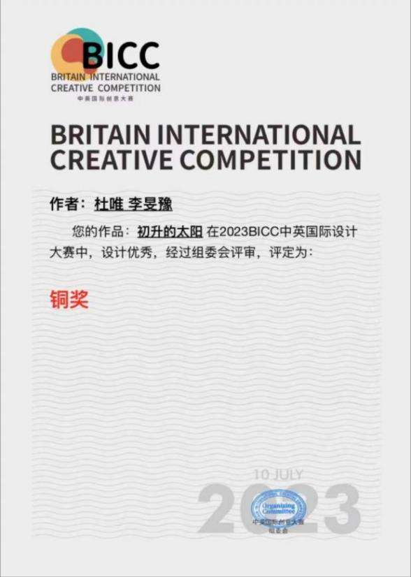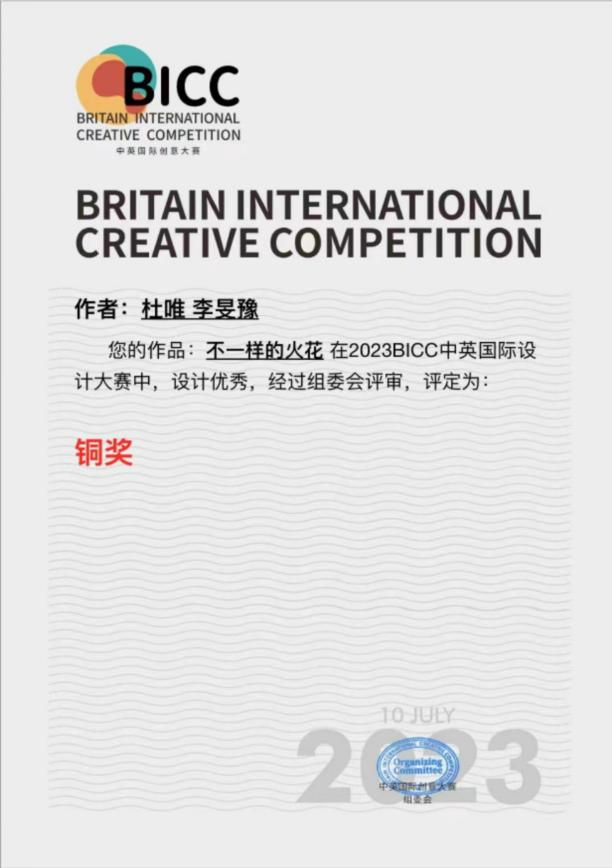 Competition)为鼓励和支持中英两国艺术专业大学生、艺术家和设计师的思维发展,为中英两国艺术家、设计师提供一个交流和创作发展平台。我校21级数字影像系杜唯、李旻豫同学作品《不一样的火花》和《初升的太阳》均获得铜奖。