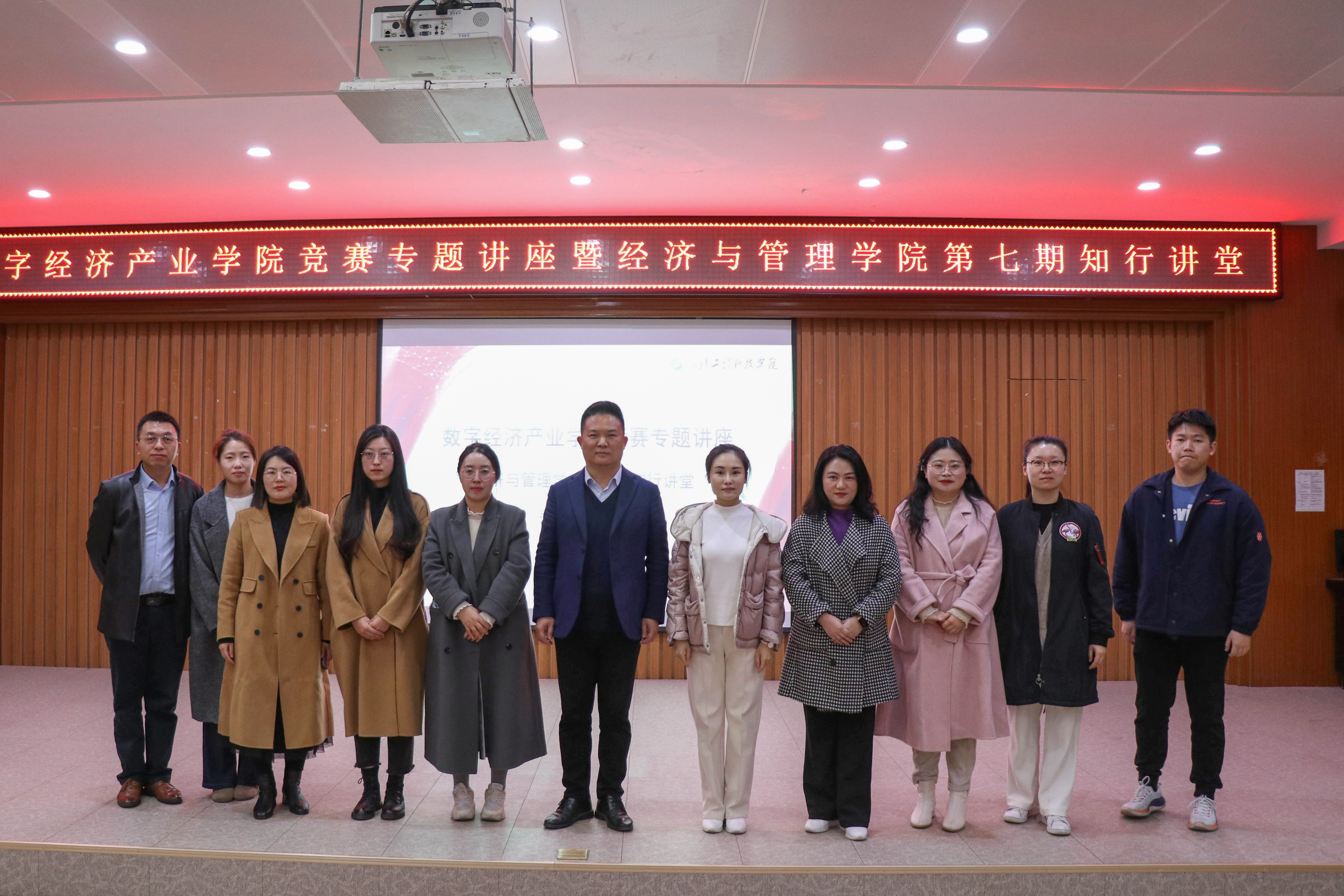 最后,现场领导嘉宾合影留念。至此,武汉工程科技学院数字经济产业学院竞赛专题讲座暨第七期知行讲堂圆满结束。