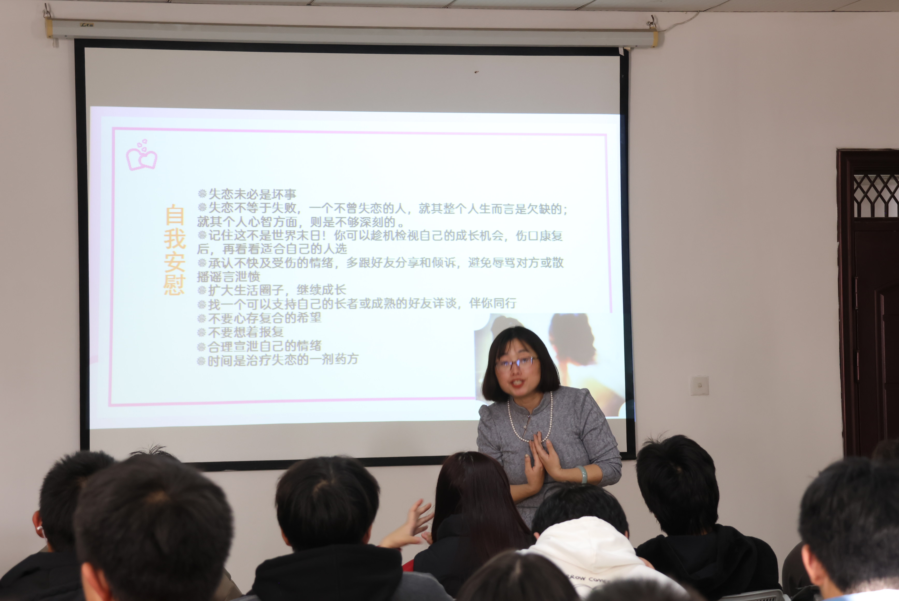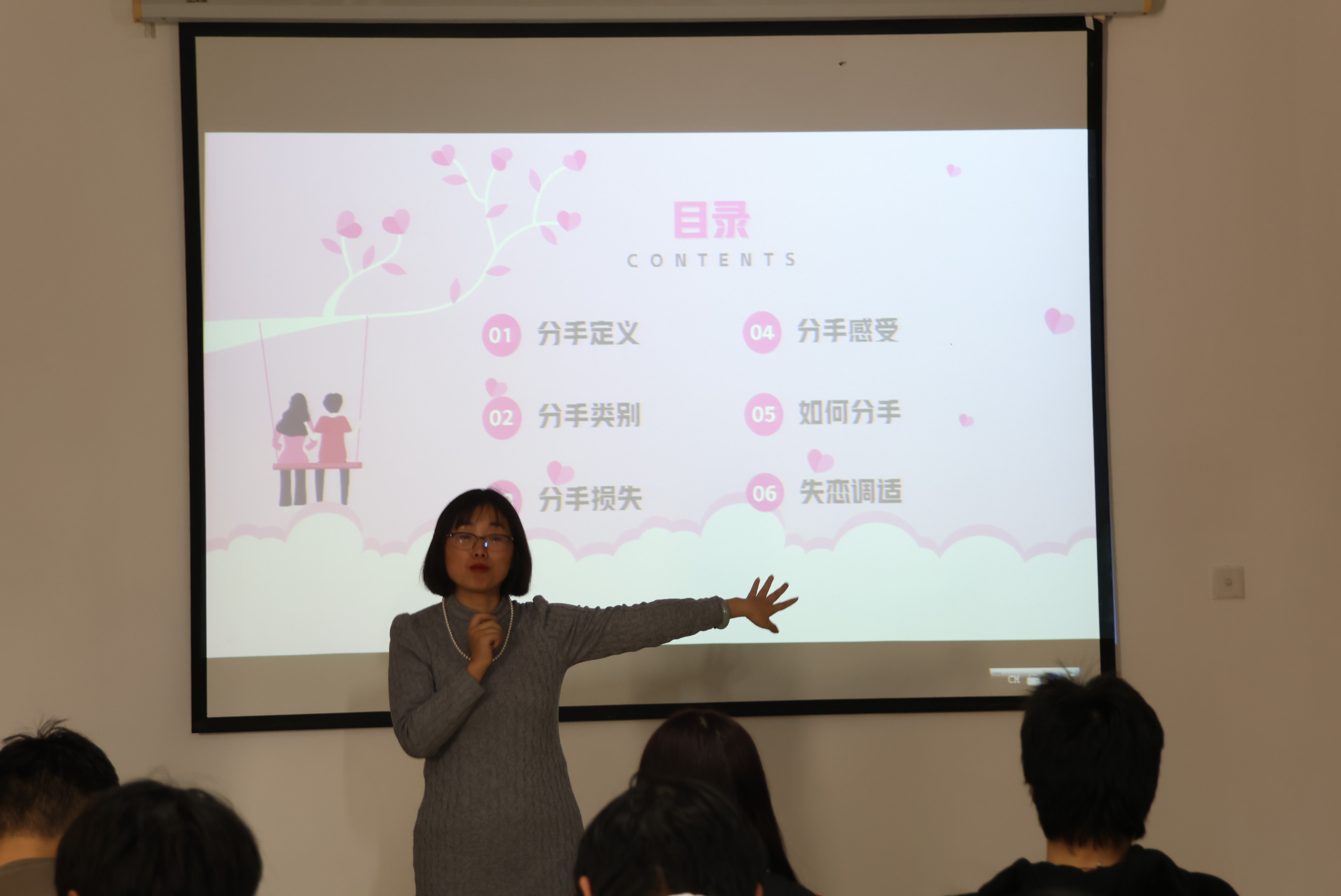 接着,刘老师老师从案例着手,用一个个鲜活的事例向大家展示从一段失败的恋爱中走出来继续好好生活的相关方法和途径。分手和创伤不可怕,重要的是要向前看,让自己走出阴霾,乐观面对以后的生活。刘老师还表示,寻求帮助是智者,此次讲座就是为同学们普及恋爱心理知识,启发同学们关注自己和他人的成长感受,树立正确的恋爱观和人生观,当自身遇到解决不了的事情或深陷痛苦无法自拔时,要学会及时寻求帮助,并为同学们提供了心理帮助的相关联系方式。